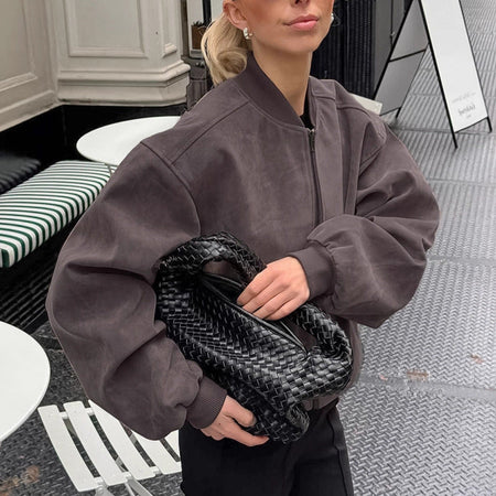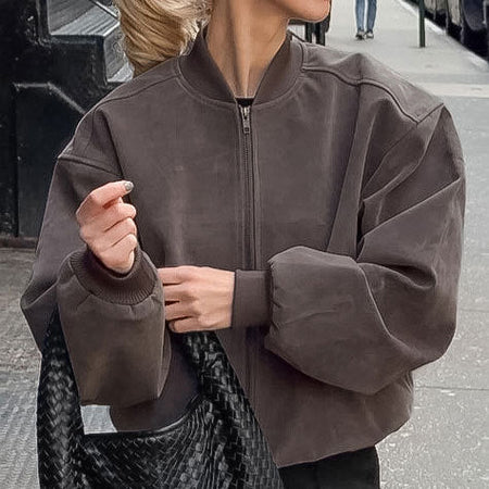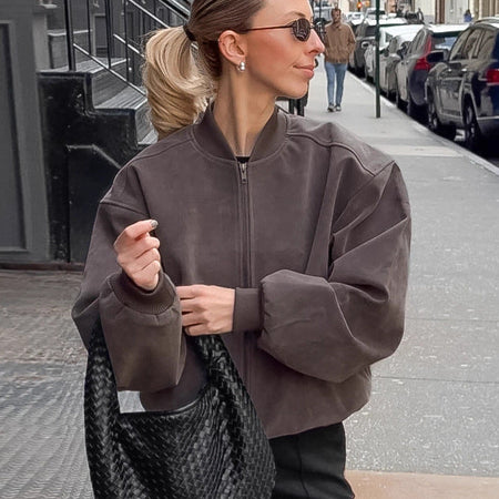 Crafted from premium suede fabric, the jacket has a soft, luxurious texture that feels as good as it looks. The front zipper closure makes it easy to wear, and the classic pilot style adds a bold, confident edge to your outfit. Its versatile gray hue complements jeans, skirts, or dresses, making it a must-have for both casual outings and streetwear looks 🏙.