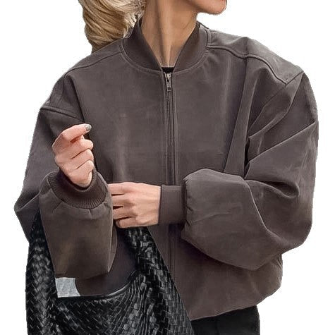 Gray Suede Stand Collar Pilot Jacket for Women