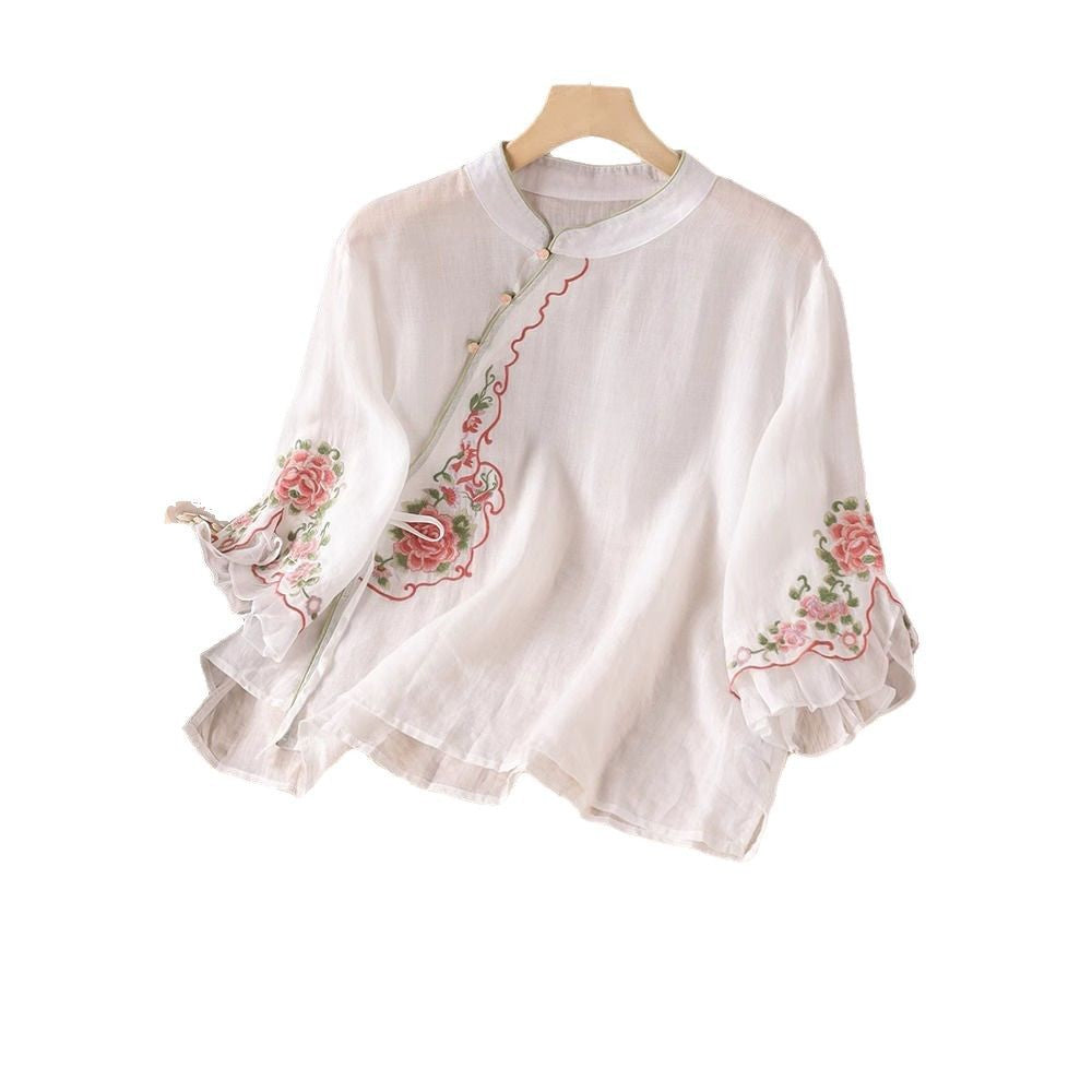 Crafted from breathable cotton, this top features a slant placket, ethnic-style buttons, and delicate embroidery, creating a graceful silhouette inspired by traditional tea clothing. The seven-point sleeves add a touch of timeless beauty, ideal for summer days or cultural gatherings. 🧵✨