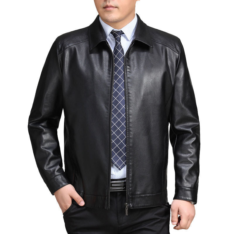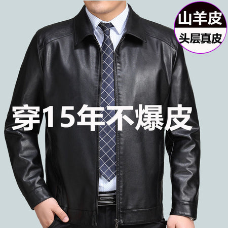 Upgrade your wardrobe with the Haining First-Layer Sheepskin Leather Jacket, designed for middle-aged and elderly men who want a blend of classic style and lightweight comfort. Perfect for spring and autumn, this thin leather jacket features a lapel collar and refined tailoring for a sophisticated yet casual look.