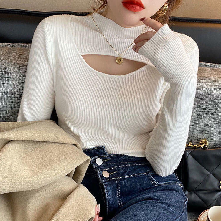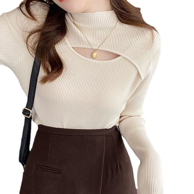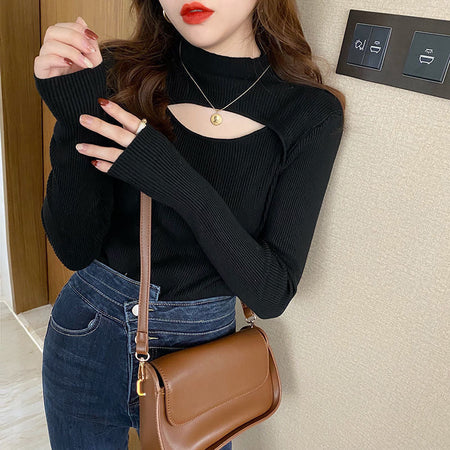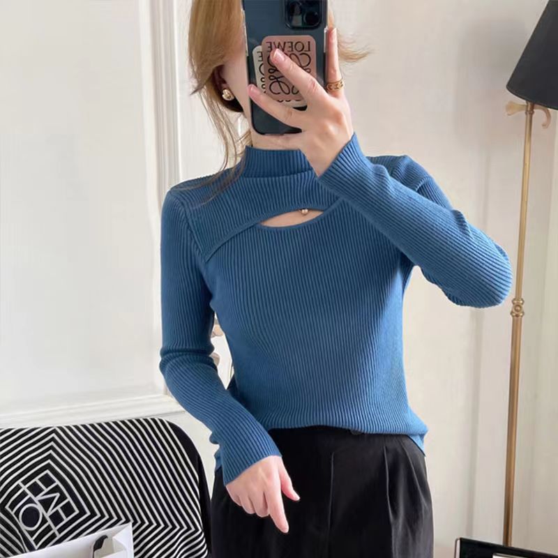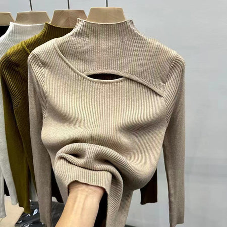 Crafted with soft, high-quality yarn, it feels gentle against the skin while keeping you warm during cooler months. The half-turtleneck design adds elegance and versatility, perfect for layering under jackets or wearing alone for a stylish statement. The unique cut-out detail gives a fashionable edge, making this top suitable for casual outings, office wear, or cozy indoor settings.