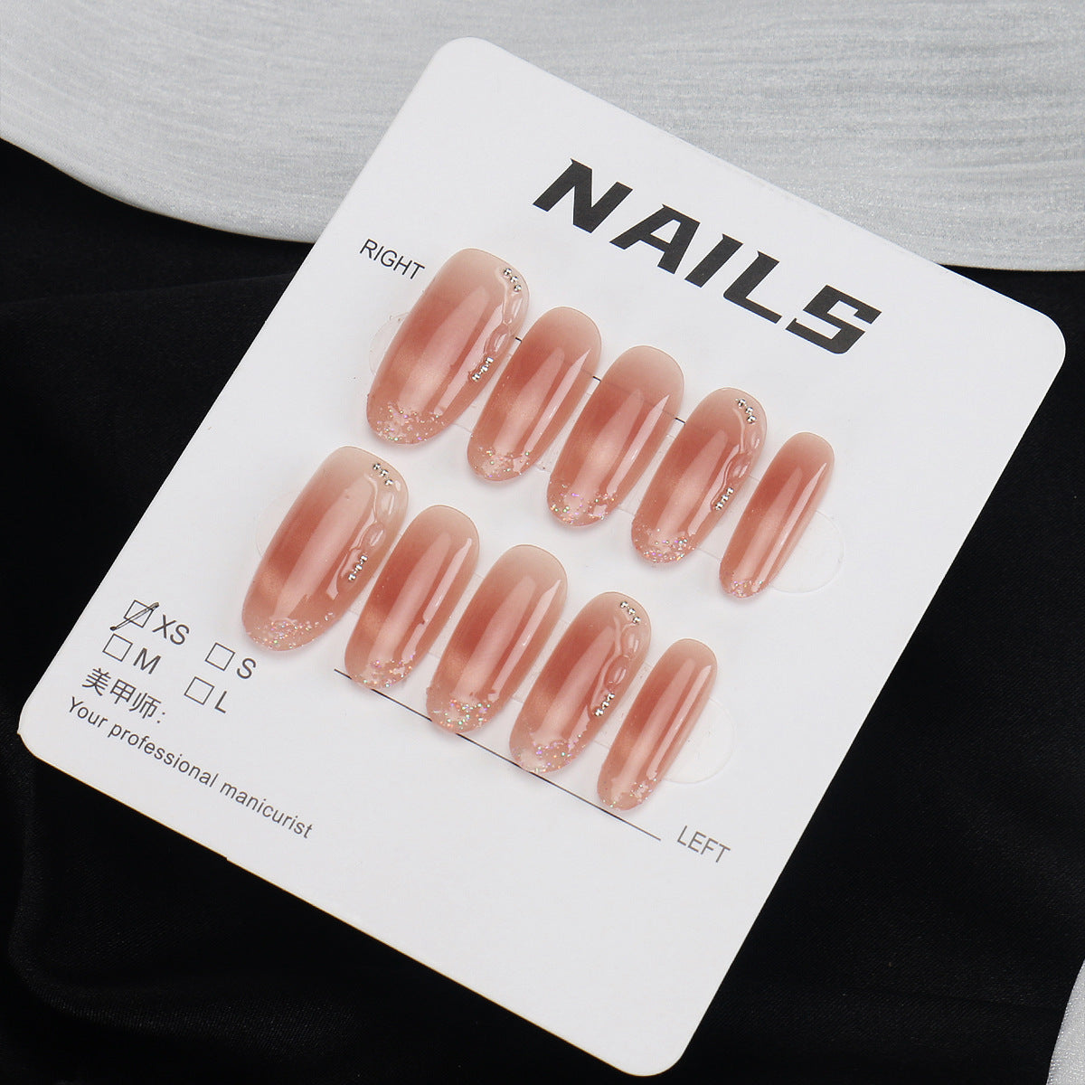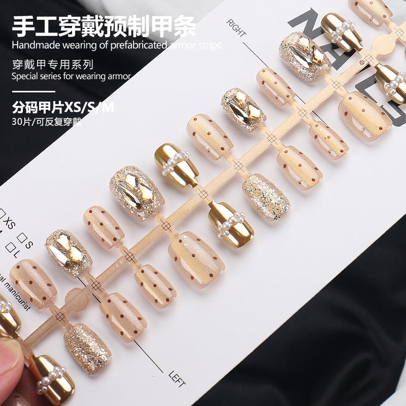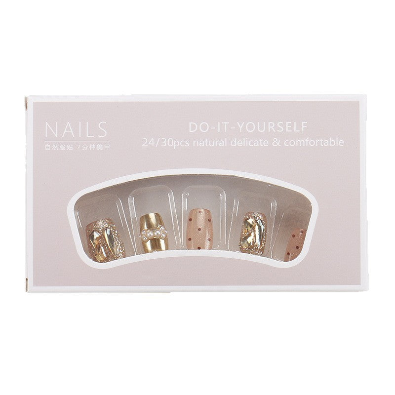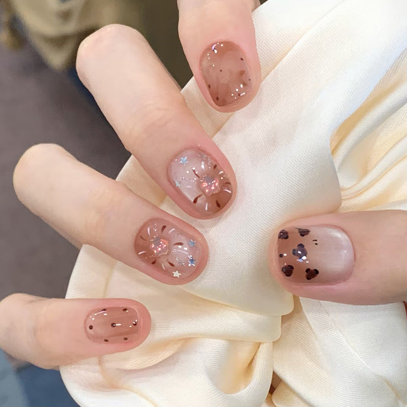 Handmade Nude Brown Polka Dot Pearl Glitter Short Fake Nails