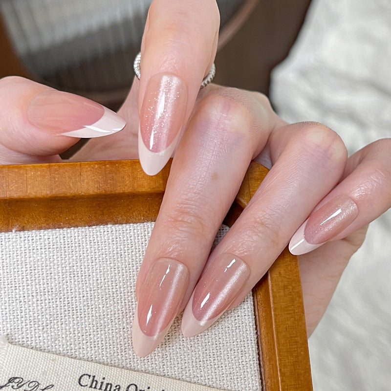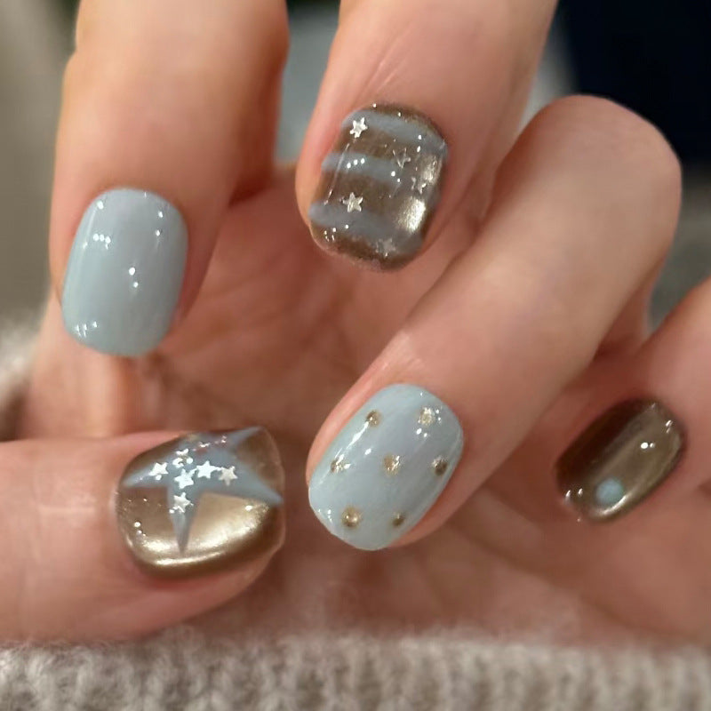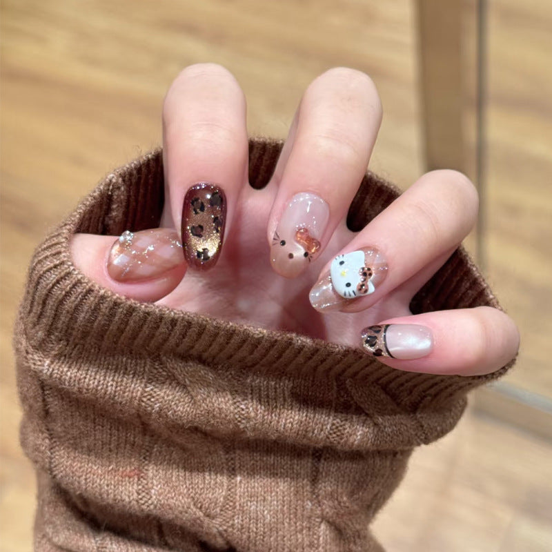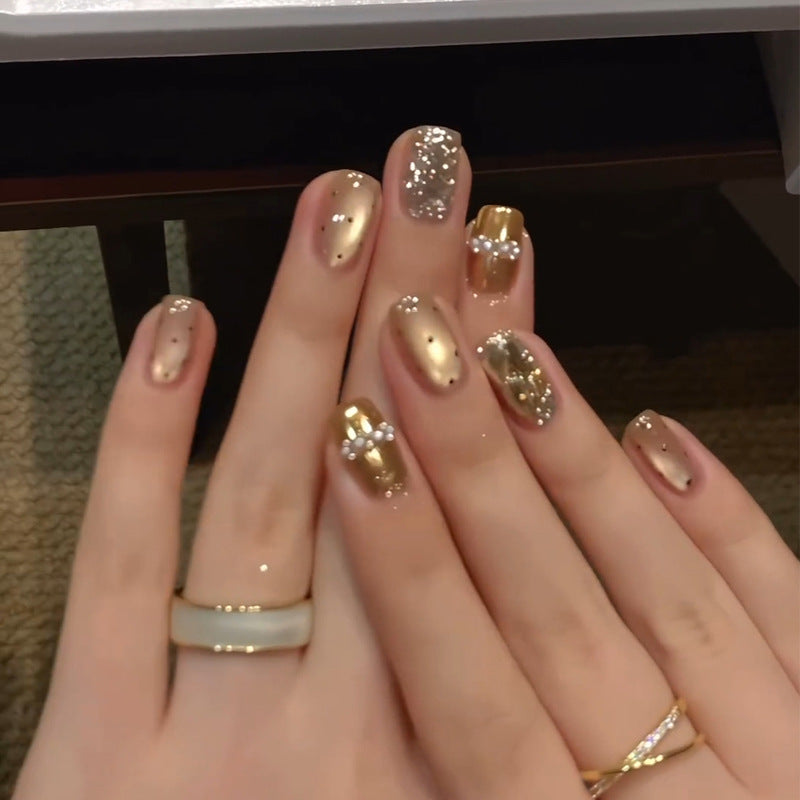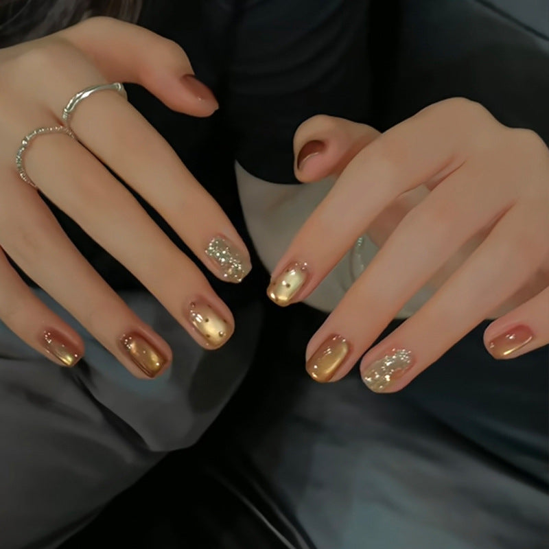 Handmade Nude Brown Polka Dot Pearl Glitter Short Fake Nails