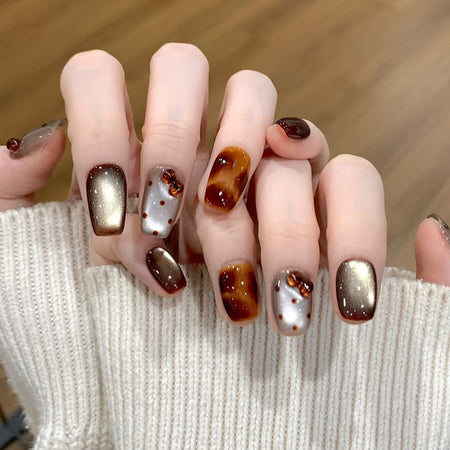Elevate your manicure with these Handmade Wearable Nails, combining nude brown tones, polka dots, and pearl glitter for a high-end, retro-inspired look 🌿✨. Perfect for daily wear or special occasions, these short, light luxury nails are designed to give your hands an elegant, polished style effortlessly.