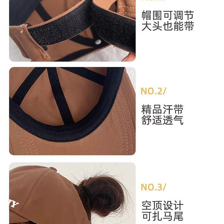 summer high ponytail baseball cap, designed for women who want sun protection without sacrificing fashion. The half-empty top design lets you comfortably wear your ponytail up, while the net red peaked cap style adds a trendy, fresh look.
