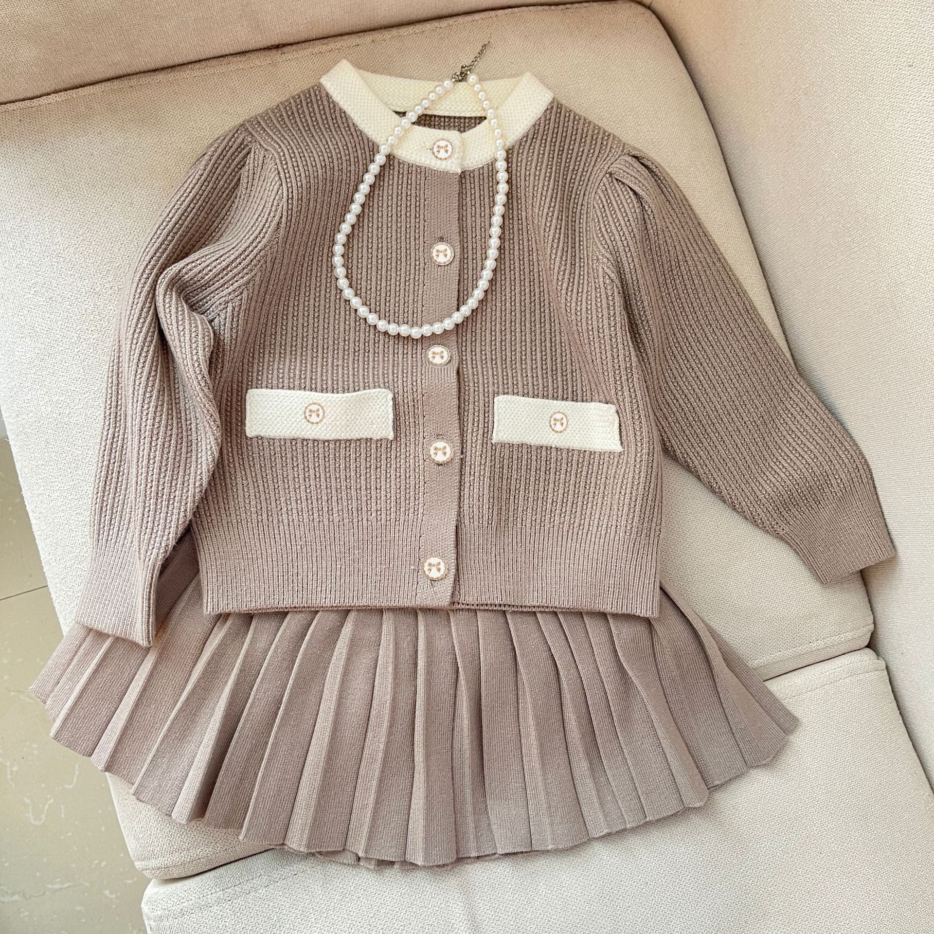 Elevate her seasonal wardrobe with this Girls’ Autumn and Winter Knitted Two-Piece Set 🍂. Featuring a chic small-fragrant cardigan sweater paired with a matching skirt, this outfit blends elegance with warmth.