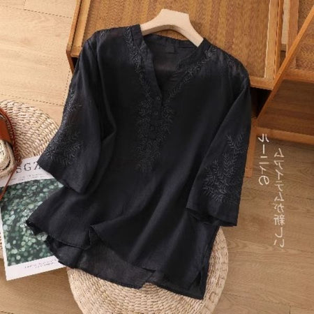 The delicate embroidered design adds a touch of artistic charm, while the V-neck cut elongates the neckline and brings a flattering, age-reducing effect. π©π¨π The short half-sleeves offer just the right coverage, and the loose fit ensures comfort without compromising style.