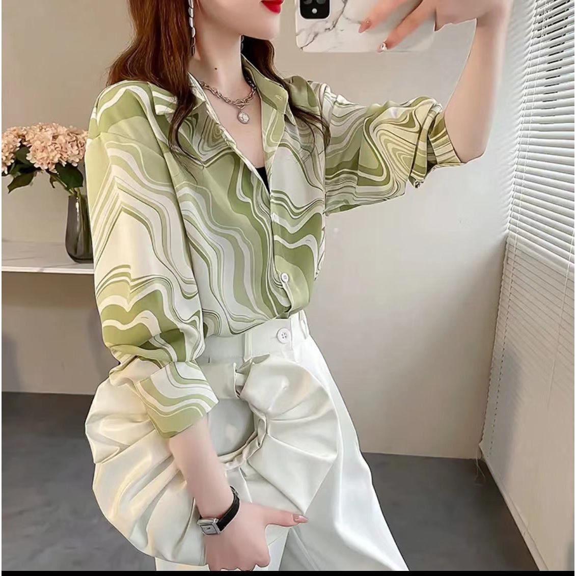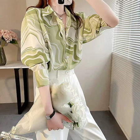 🌿 Elegant & Effortlessly Stylish! This South Korean-inspired green striped chiffon shirt is the perfect addition to your 2024 autumn wardrobe. With its long sleeves, light, and breathable chiffon fabric, this shirt exudes a mature French fashion design that’s both refined and chic.