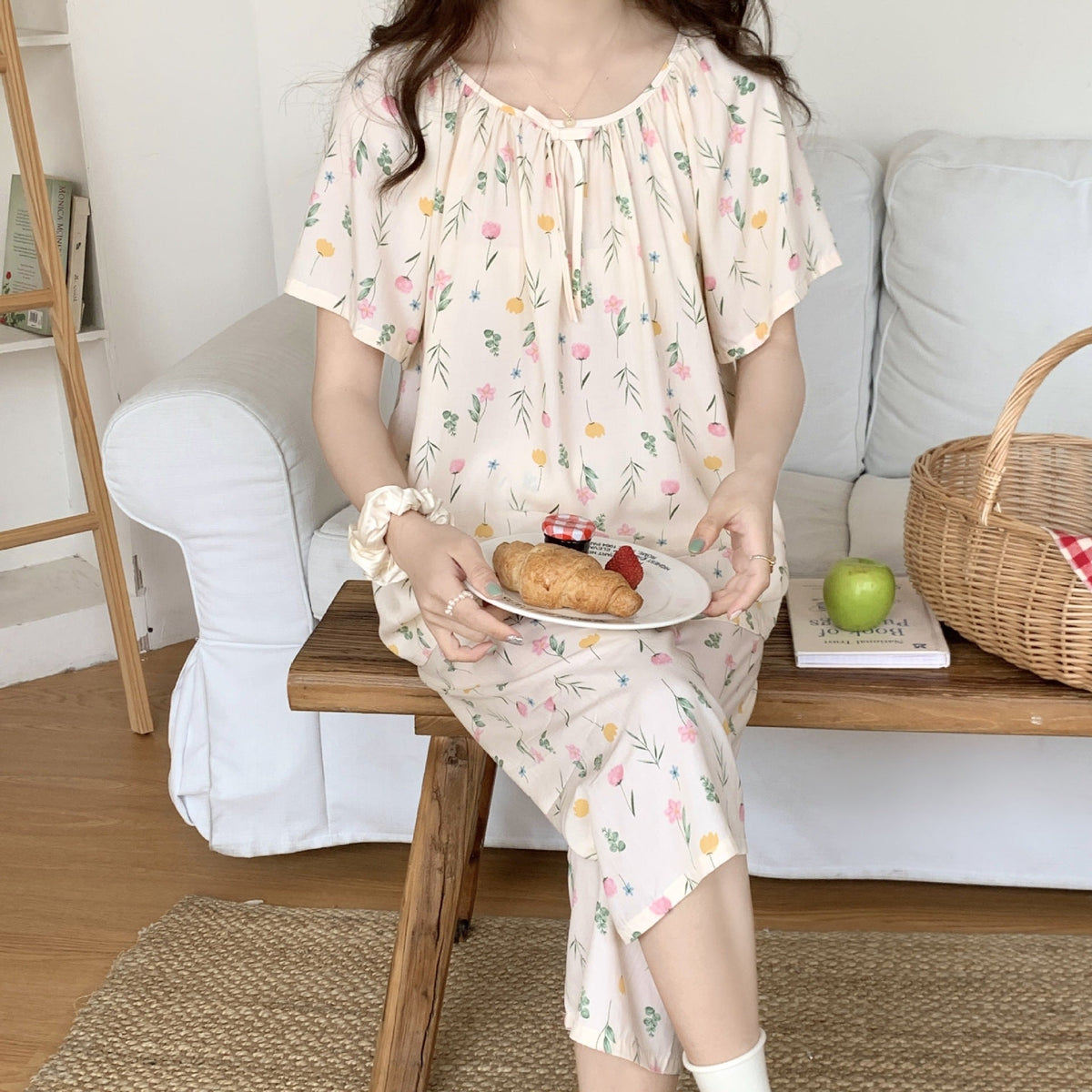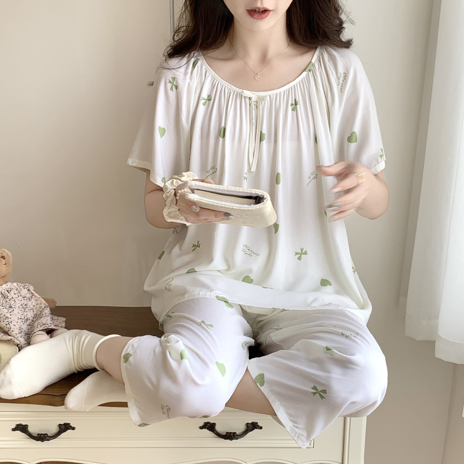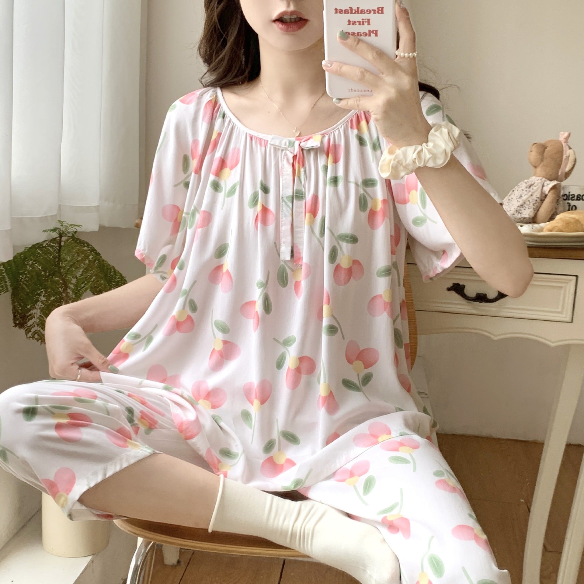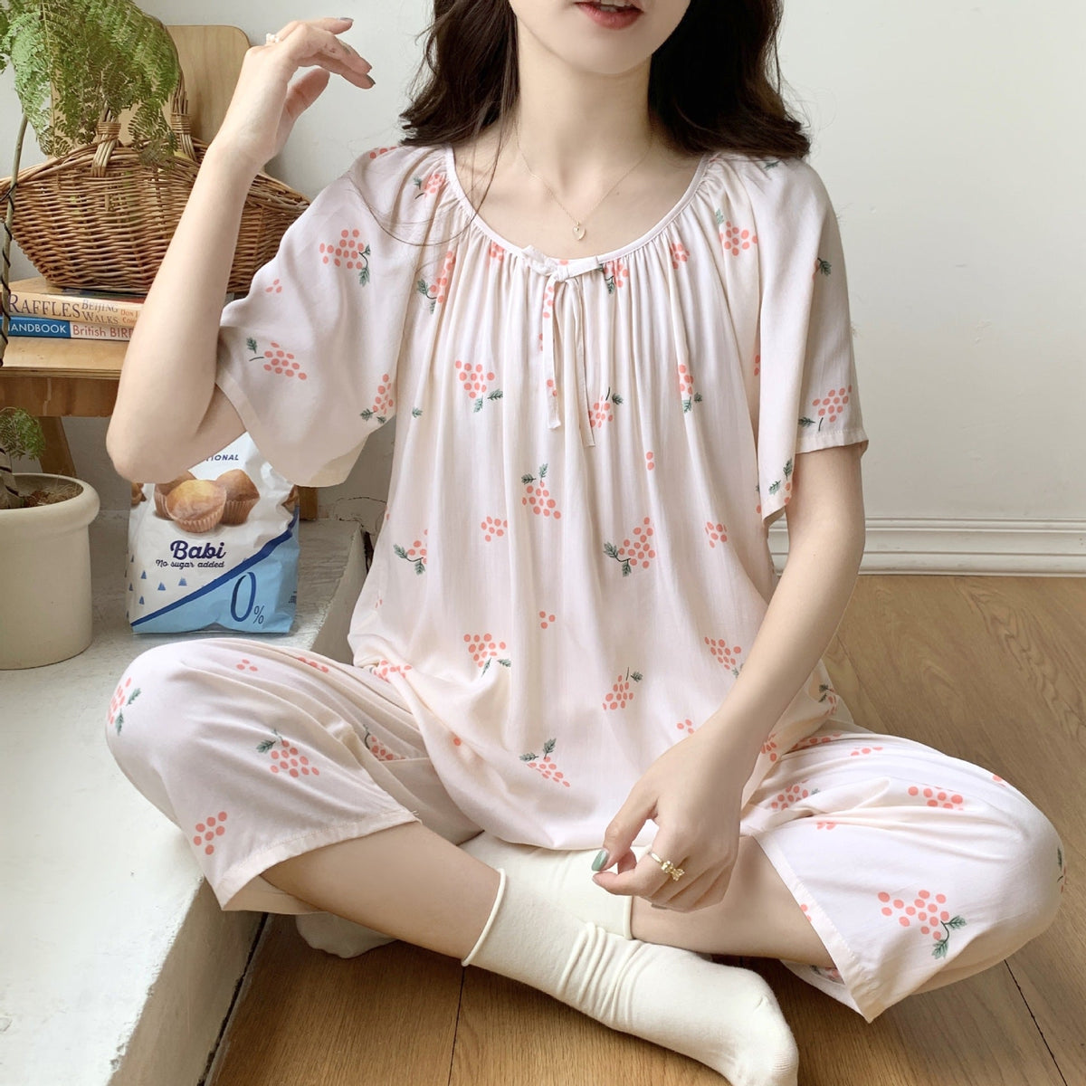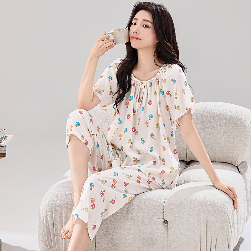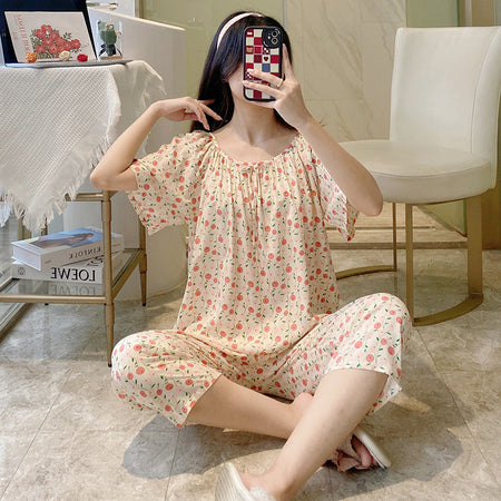 🌸 Stay cool, comfy, and effortlessly cute in this women’s cotton silk pajama set! With a fresh pastoral vibe, round neck, and cropped pants, this short-sleeved suit is perfect for sunny days, lazy mornings, or cozy nights at home ☀️🛏️.