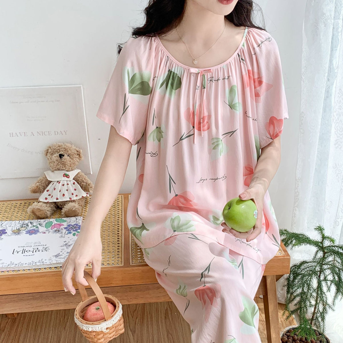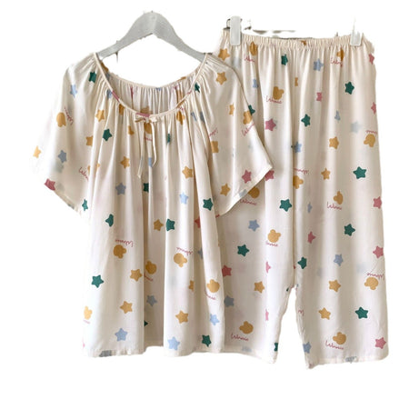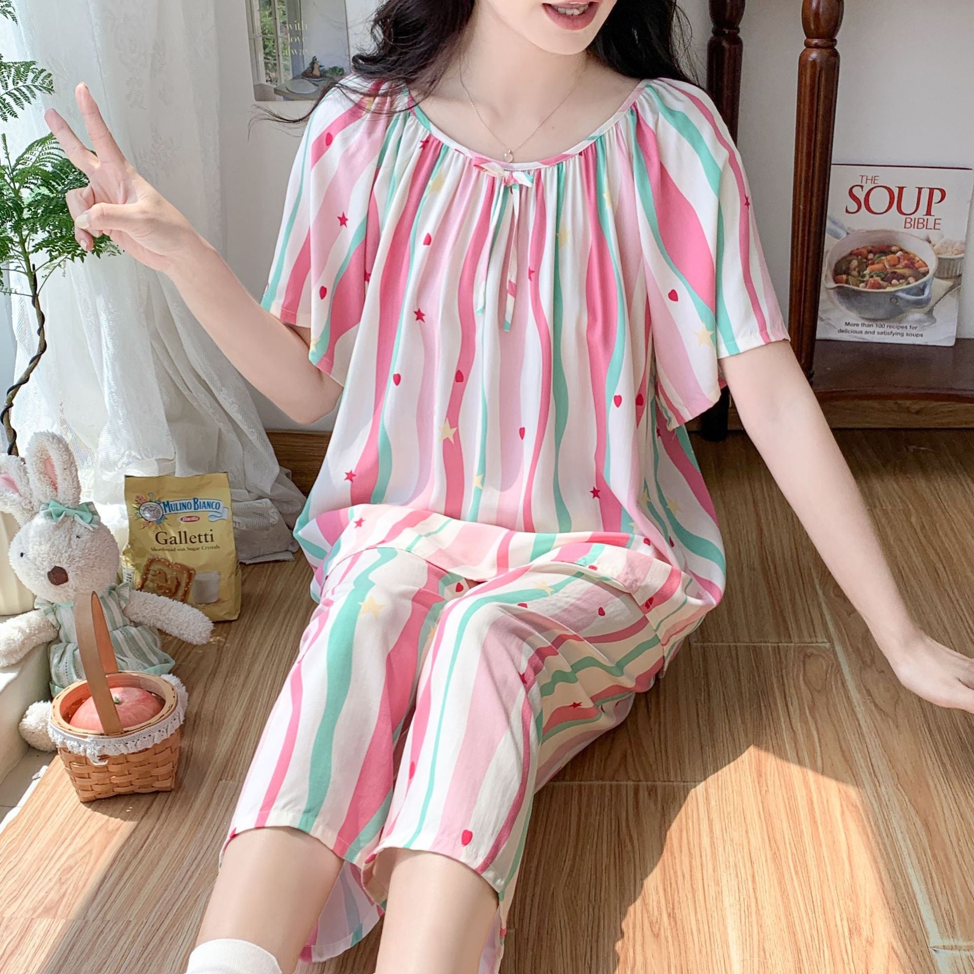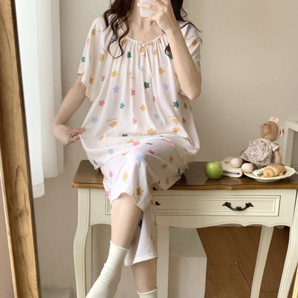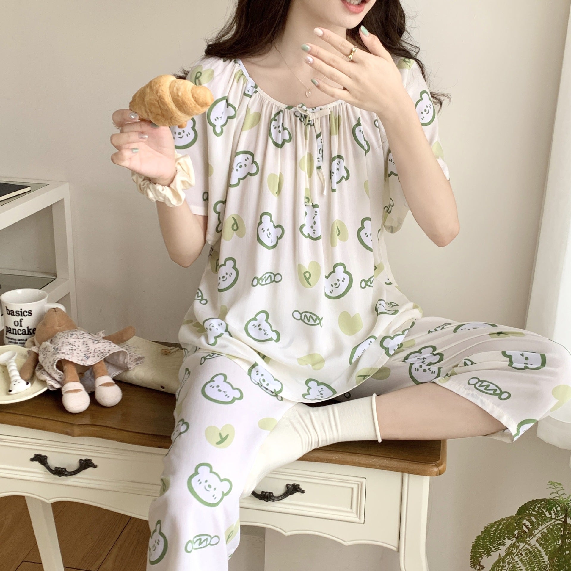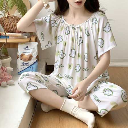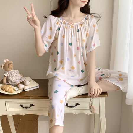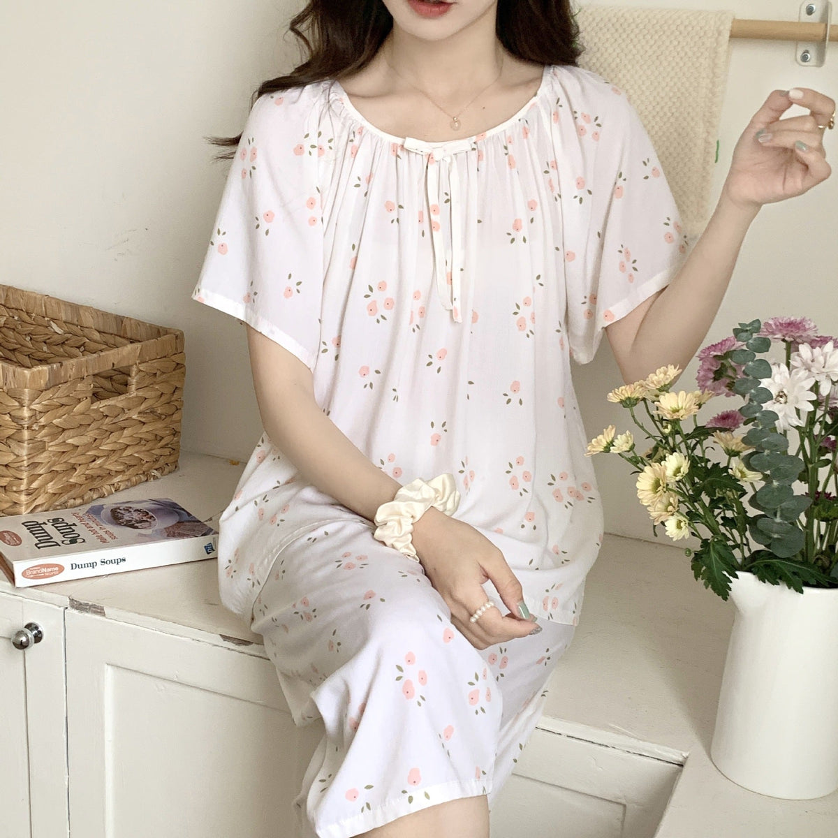 🌸 Stay cool, comfy, and effortlessly cute in this women’s cotton silk pajama set! With a fresh pastoral vibe, round neck, and cropped pants, this short-sleeved suit is perfect for sunny days, lazy mornings, or cozy nights at home ☀️🛏️.