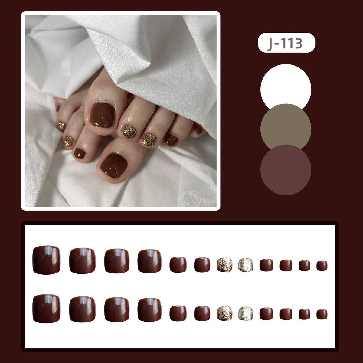 Step into style with the J-113 Chocolate Gold Toenail Set — a luxurious set of pre-designed fake toenails that bring salon beauty right to your feet ✨🦶.