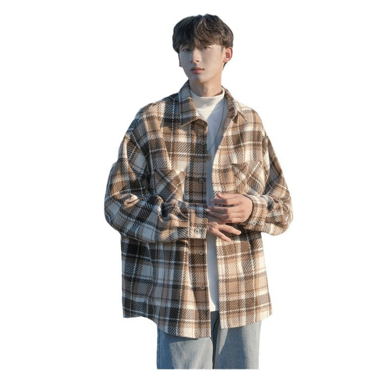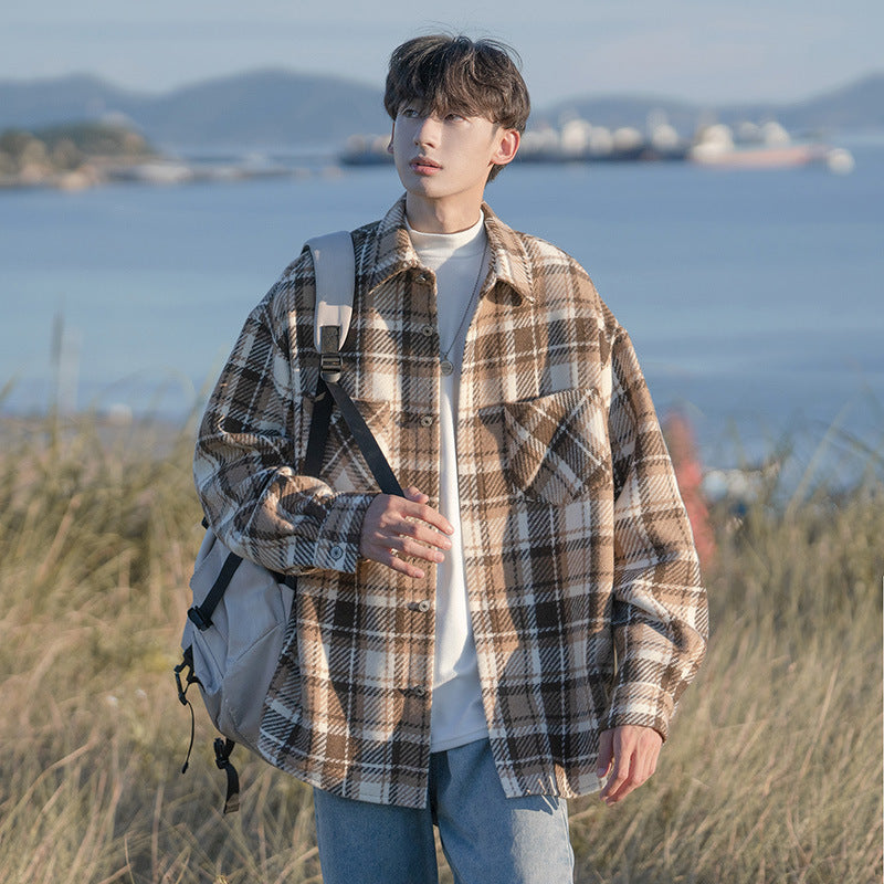 Channel effortless cool with this Japanese-style woolen plaid men’s overshirt, a vintage-inspired piece perfect for autumn and winter layering.