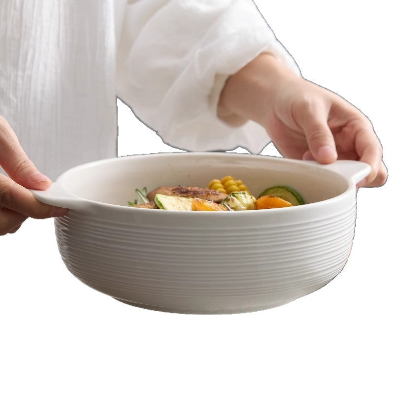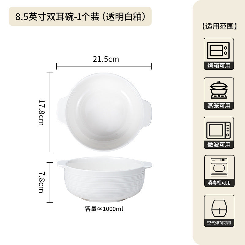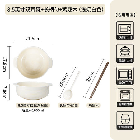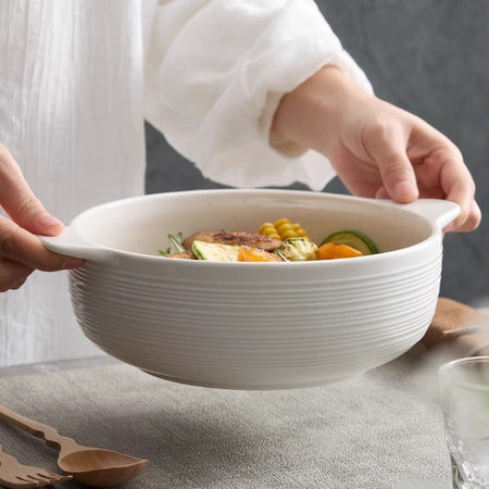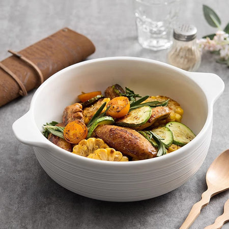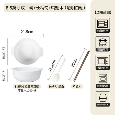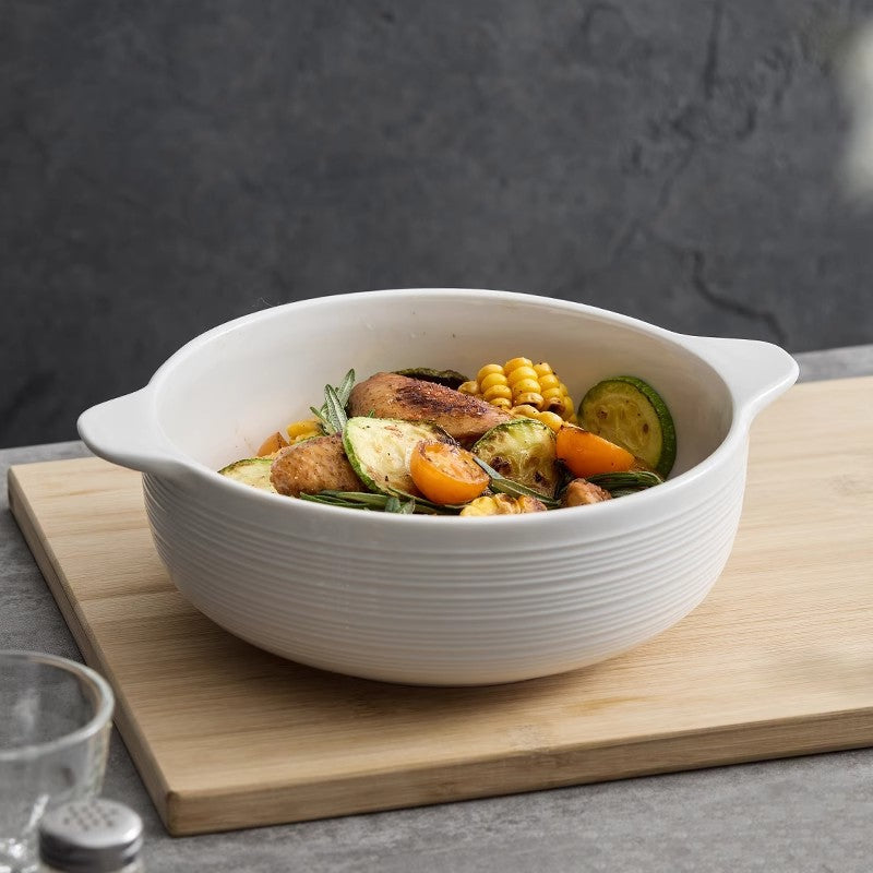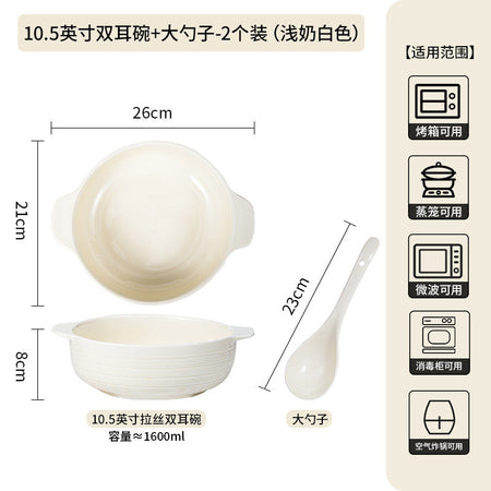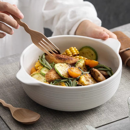 This bowl combines function and beauty. Its double handles provide safety, while the included spoon makes it a ready-to-use set. Ideal for everyday meals or stylish dinner service.