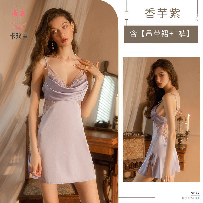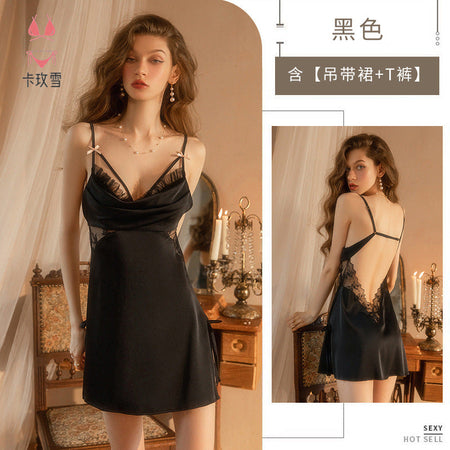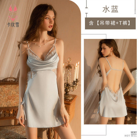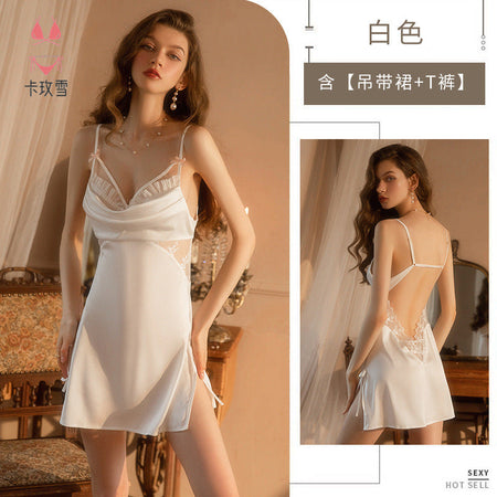 Experience passion and elegance with the Kamei Snow Sexy Silk Nightgown! ❄️🌙 Crafted from thin, smooth silk, this exquisite nightwear features a delicate lace design with a captivating side opening and hollow details that exude pure desire.