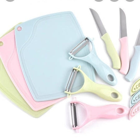 Includes knives, peeler, scissors & board