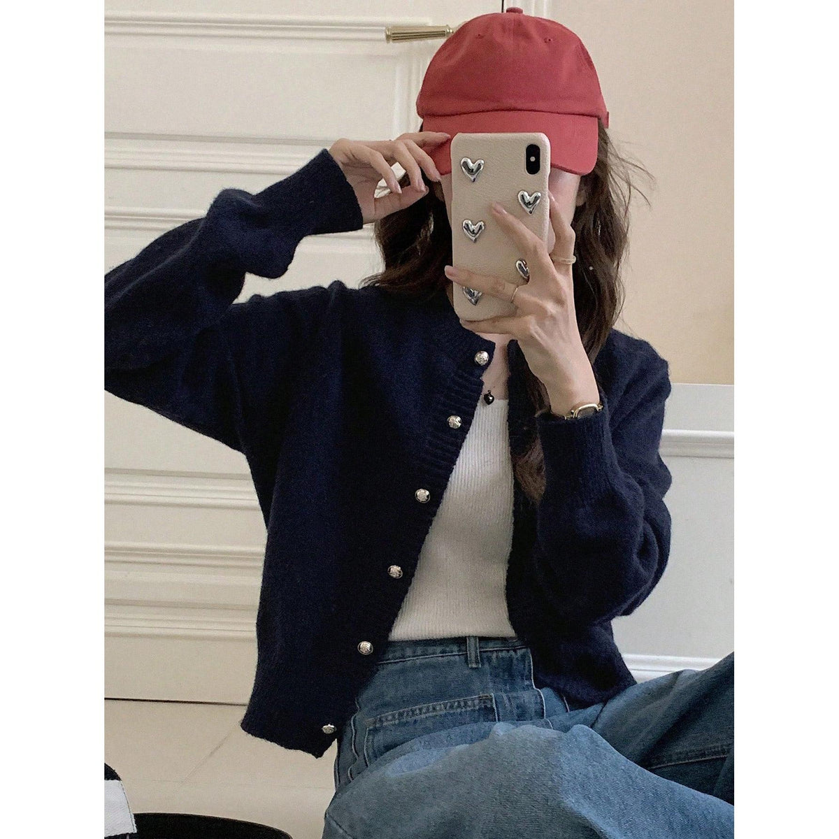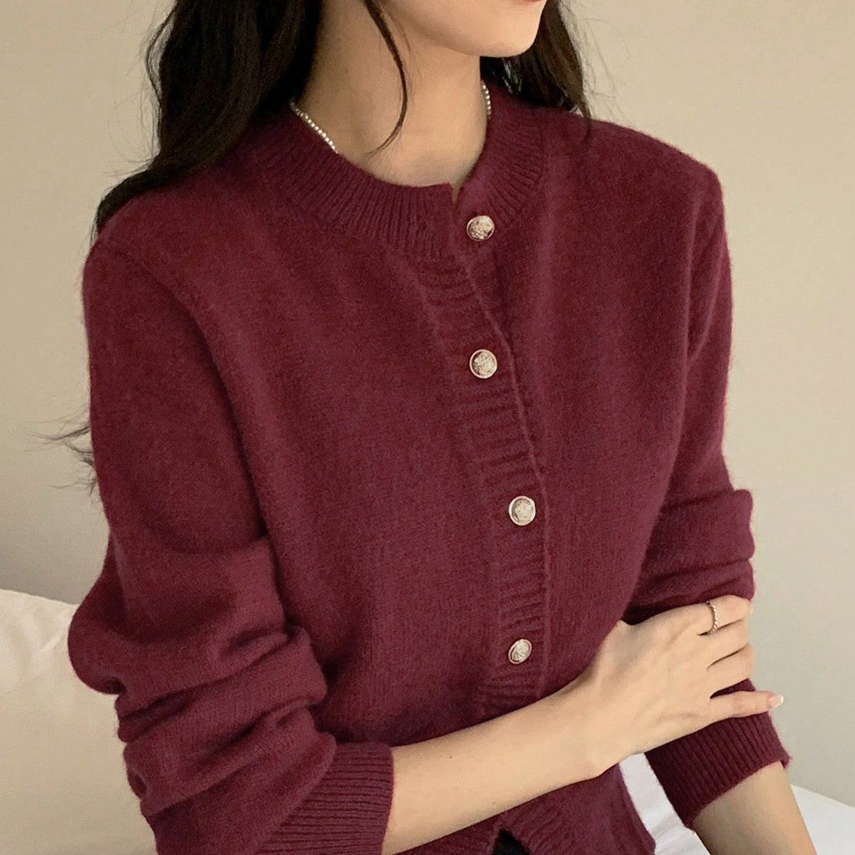 Key Features: Pure color knit, metal buttons, round neck, warm & soft, small tailored fit, Korean chic style