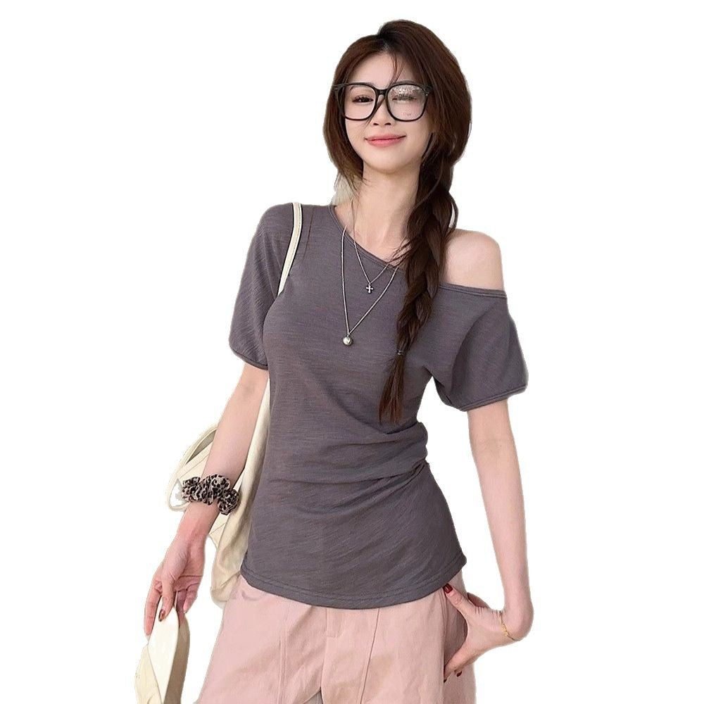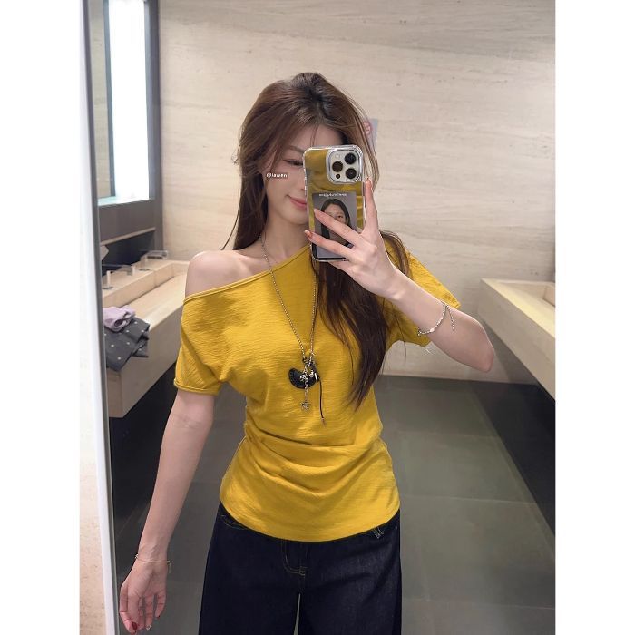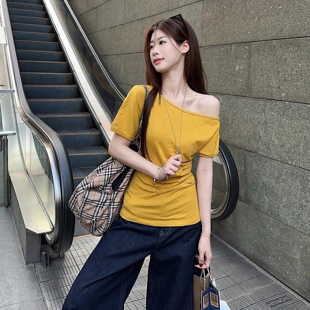 Make a bold yet elegant statement with this Korean-Style Slant Shoulder T-Shirt for Women 💫 — a perfect fusion of minimalist design and fashionable detail. This niche summer piece features a unique asymmetric shoulder cut that highlights your neckline and collarbone, giving off confident, modern energy ✨.