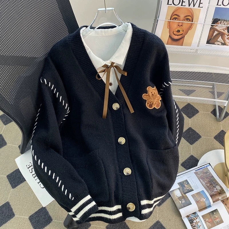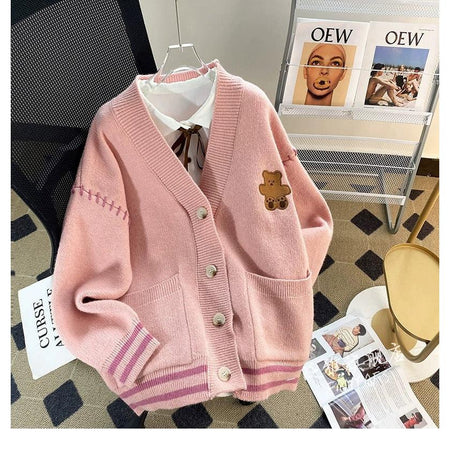 🧸 Add playful charm to your winter outfits with this Korean-style color-blocking bear cardigan. Featuring a cute bear design, drawstring pockets, and a cozy knit texture, it’s both functional and fashionable.