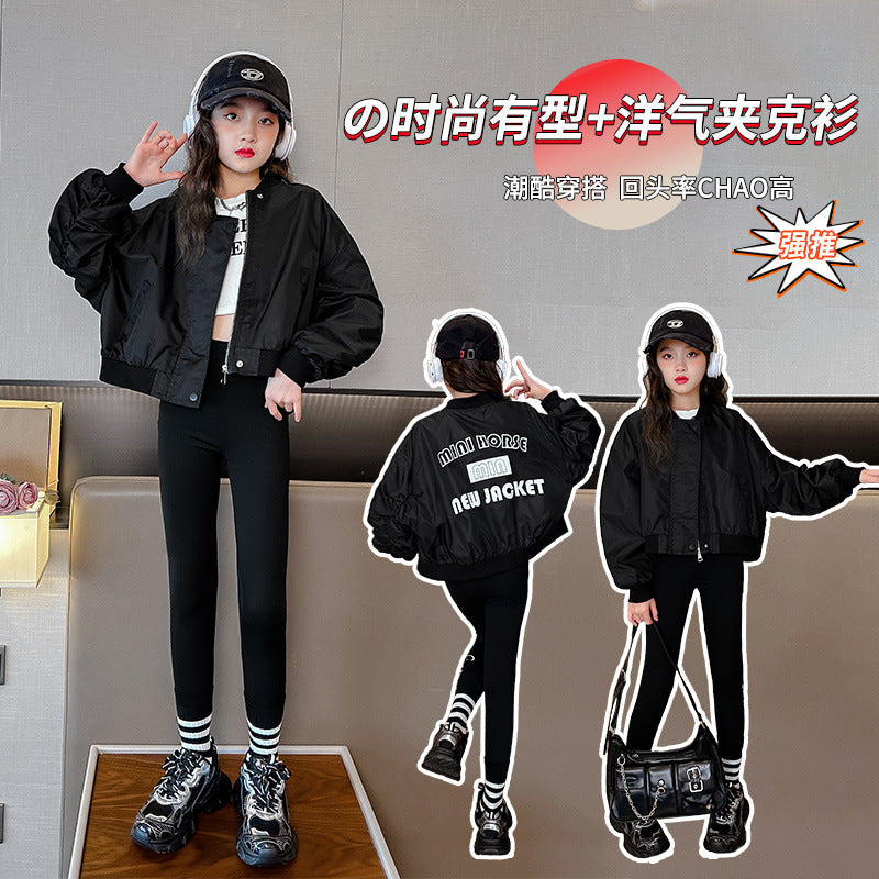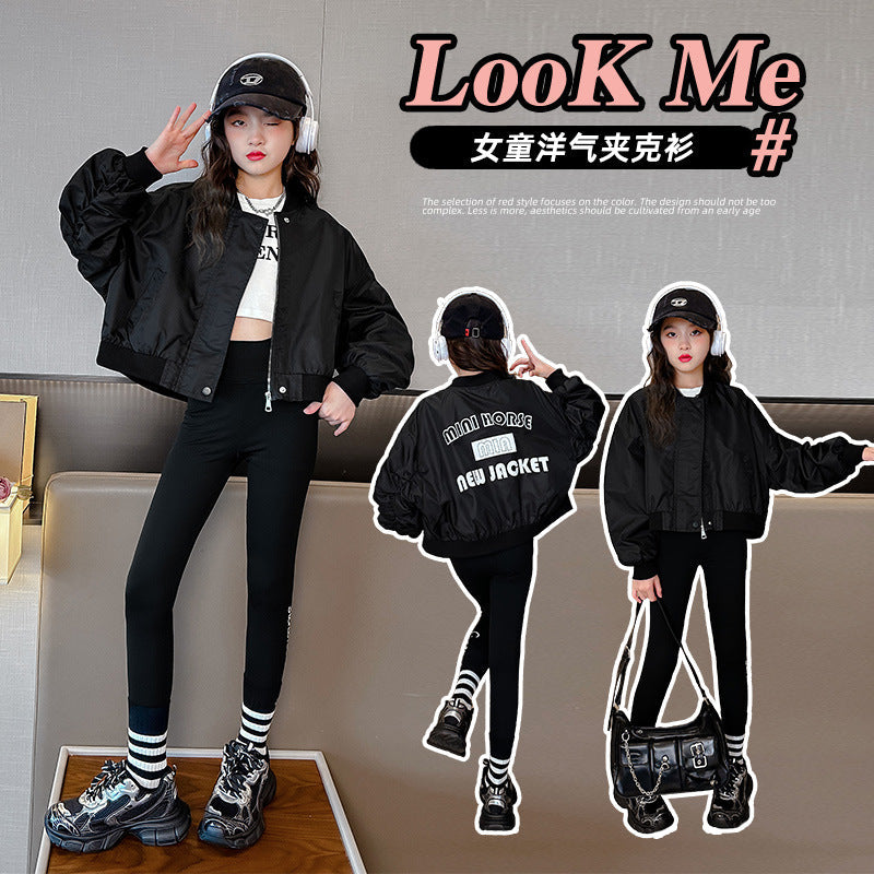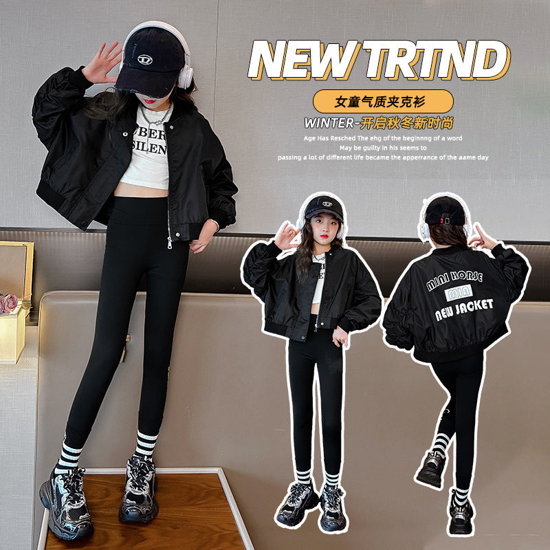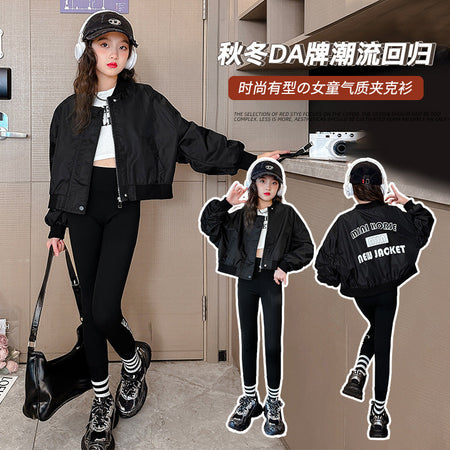 Trendy and chic, this girls’ Korean-style pilot jacket is the perfect addition to early autumn wardrobes. With a fashionable short cut and zip-up front, it’s both stylish and practical.