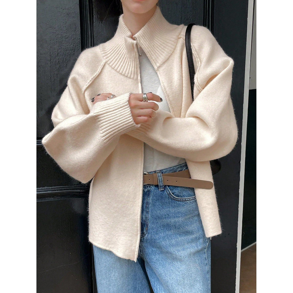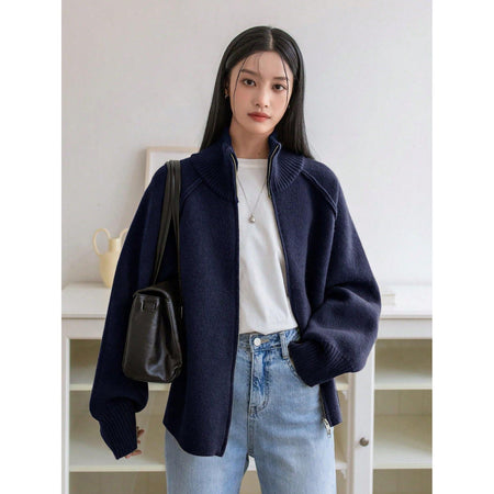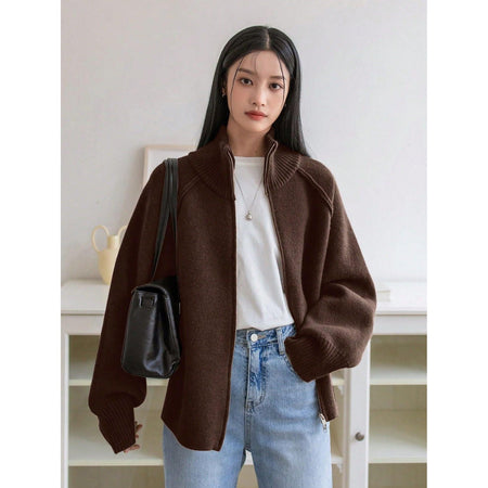Ideal for work, lounging, or weekend outings, this sweater jacket pairs effortlessly with trousers, skirts, or jeans. Its pure-color finish makes it a timeless layering piece, while the stand collar adds a subtle edge.