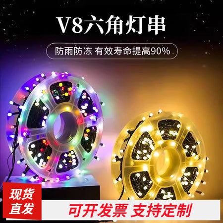 Transform your outdoor space with these mesmerizing LED Hexagonal Turntable Starry Sky String Lights. Perfect for Christmas, holidays, weddings, Tihar, Diwali, or festive outdoor decor, they add a dreamy, magical ambiance to your garden, patio, or balcony.