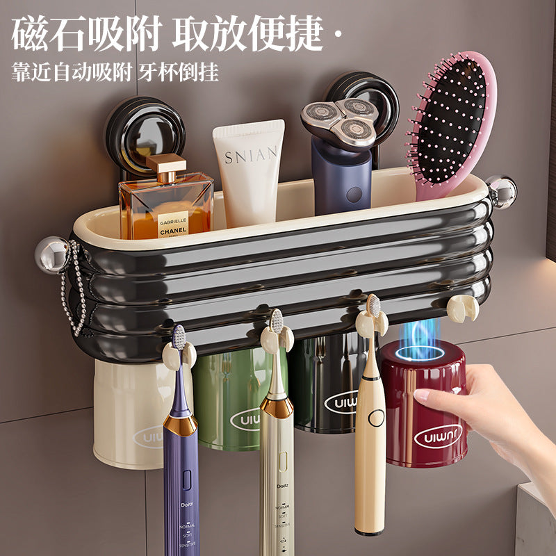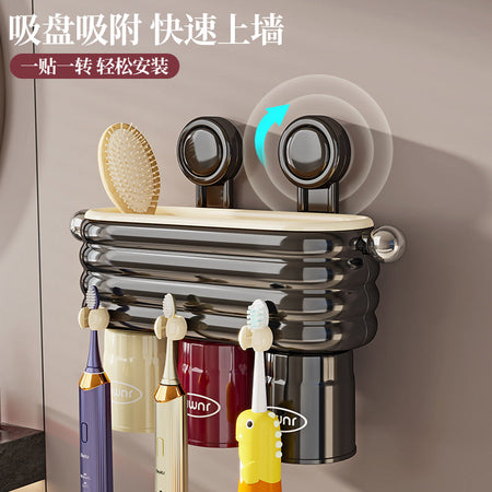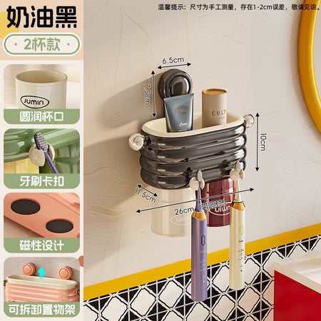 The tooth cup storage rack features compartments for toothbrushes, toothpaste, and small bathroom essentials, keeping your sink area tidy and organized. Its durable plastic construction is moisture-resistant, lightweight, and easy to clean, combining practicality with high-end aesthetics. The integrated toothpaste dispenser adds convenience for daily use.
