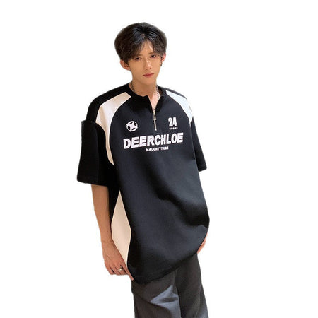 Men’s Black White Patchwork Half-Zip Biker T-Shirt