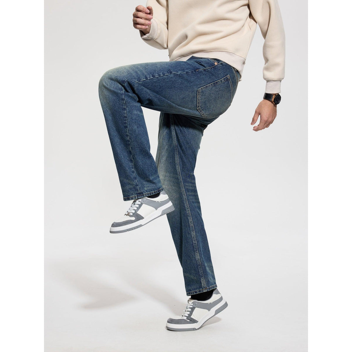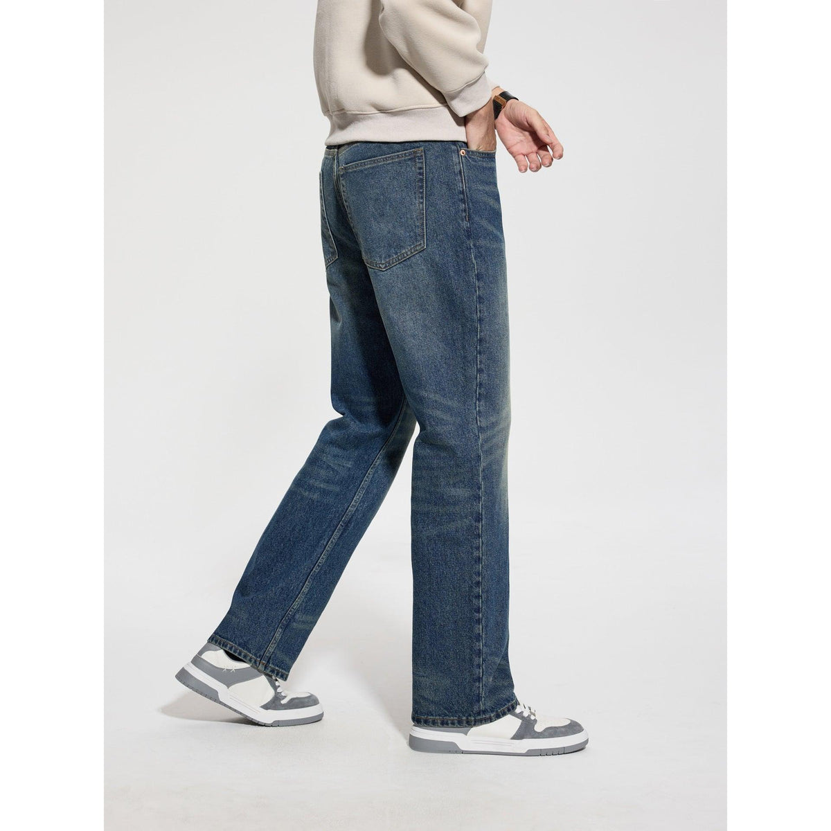 Men’s Fleece-Lined Loose Retro Distressed Straight Jeans Pants