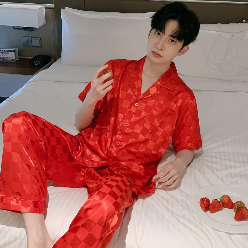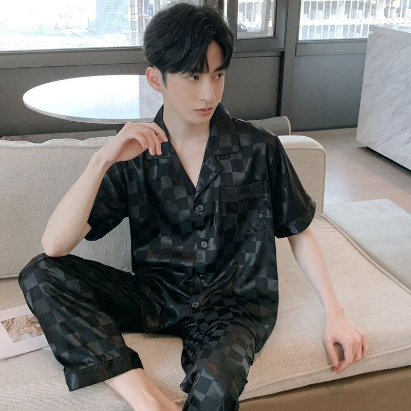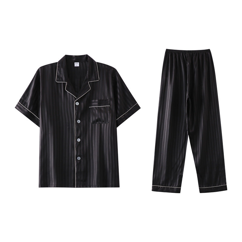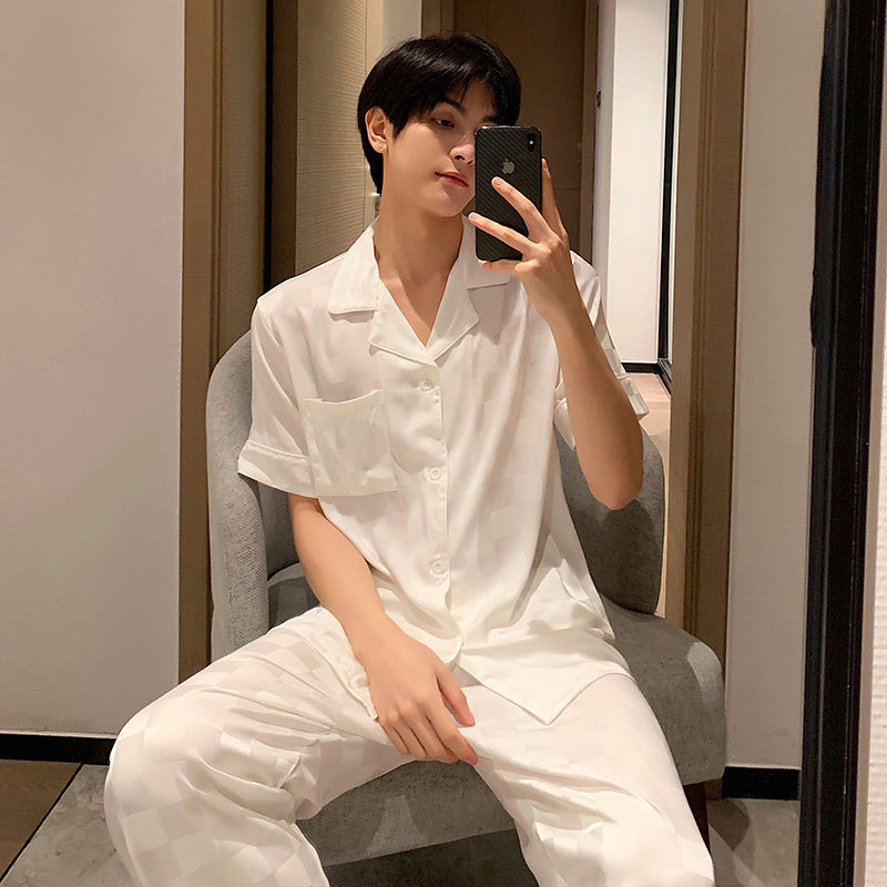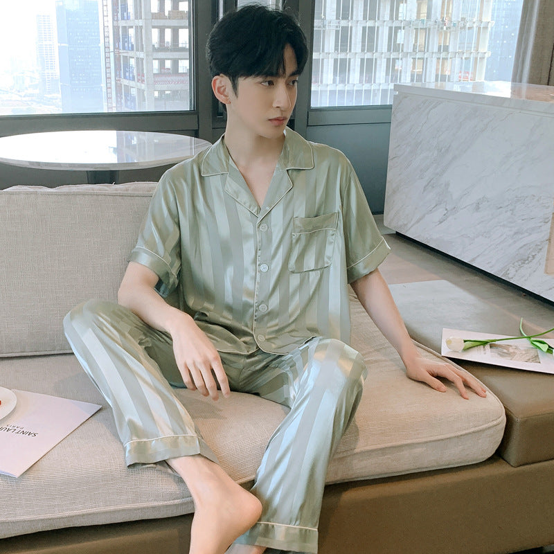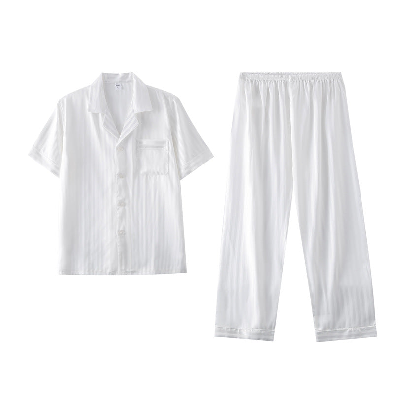 Men’s Ice Silk Pajama Set – White Striped Summer Wear