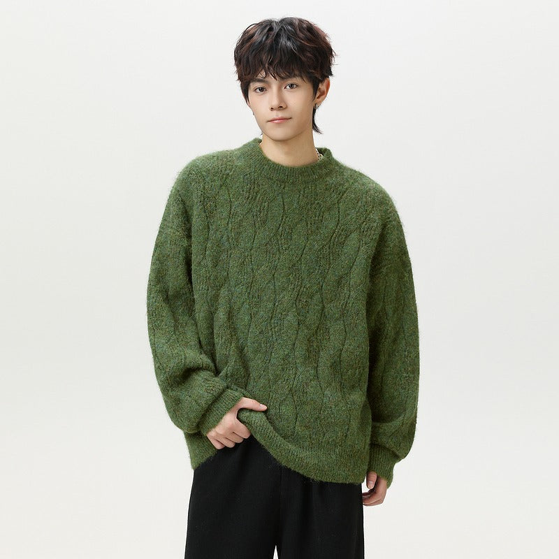 The classic cable-knit texture adds a retro and sophisticated flair, while the round neck ensures easy layering over T-shirts or shirts for versatile styling. 🌿 Its relaxed, lazy fit makes it ideal for daily wear, casual outings, or indoor lounging, perfectly blending modern trends with timeless fashion.
