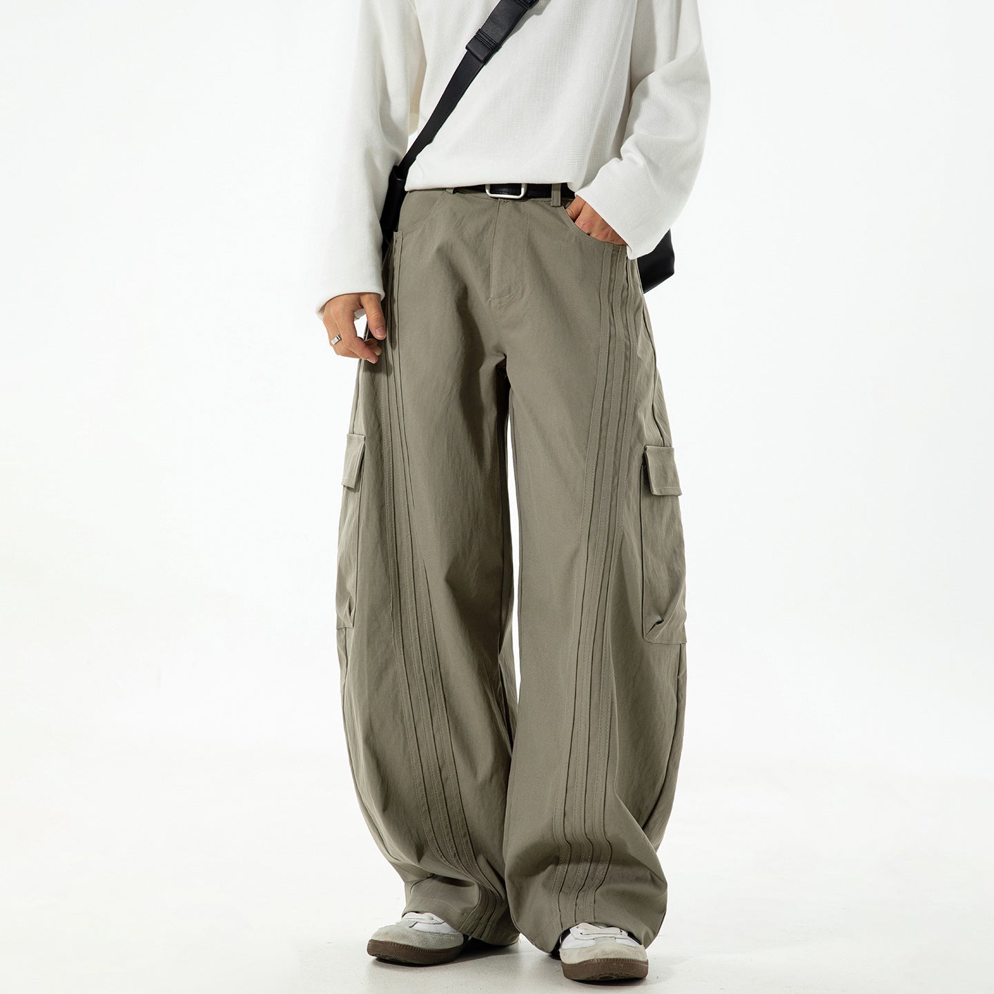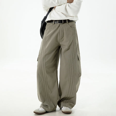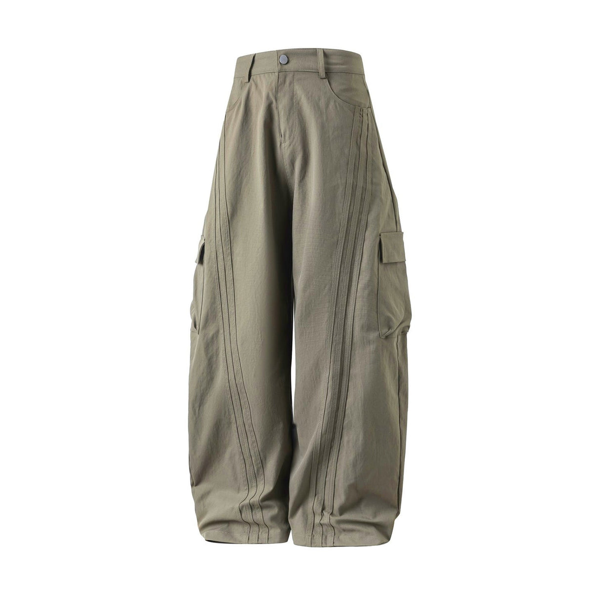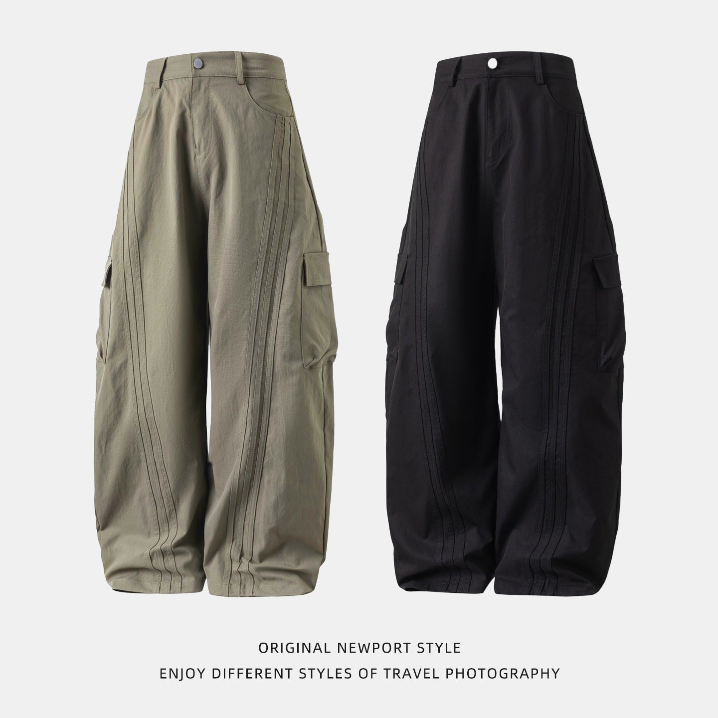 Bring edge to your outfit with these striped scimitar cargo pants for men, designed with bold 3D patch pockets and an American loose silhouette. Perfect for autumn casual wear.