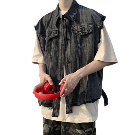 Menβs Workwear Denim Vest β Smoke Gray Raw Edge Waistcoat