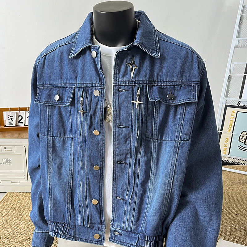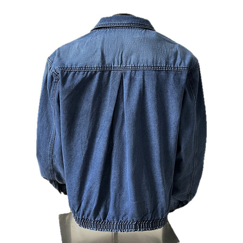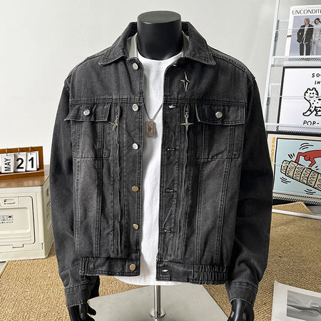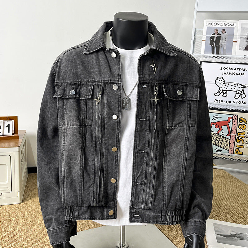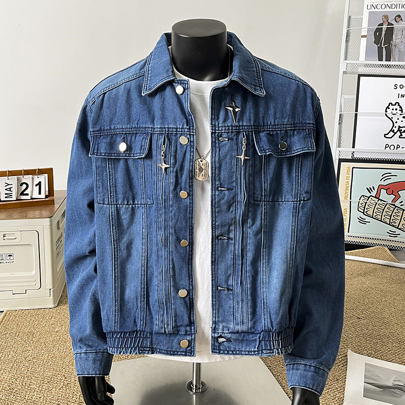 Upgrade your wardrobe with this American-style short denim jacket for men. Designed with a handsome, high-end aesthetic, it features a metal zipper, distressed details, and a casual heavy-water denim finish, blending rugged durability with fashion-forward style.