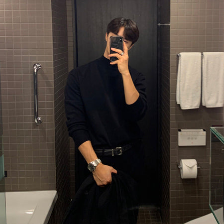 Perfect for layering under jackets, coats, or cardigans, this solid color semi-turtleneck sweater balances warmth and style. Its high-end craftsmanship and Korean-style design make it an essential piece for men seeking both elegance and practicality. 🌟💼