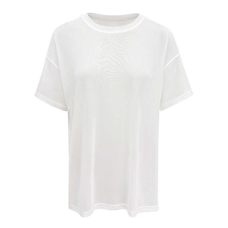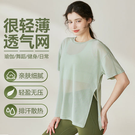 Breathe Easy and Move Freely! This new mesh yoga T-shirt for women is perfect for Pilates, training, running, or just relaxing. Designed with a loose fit and round neck, it features side splits for extra comfort and movement during every workout.