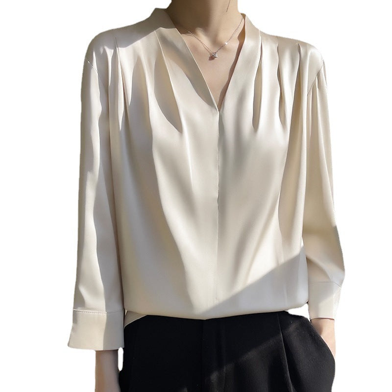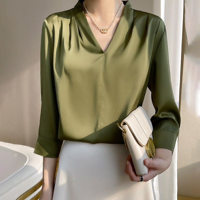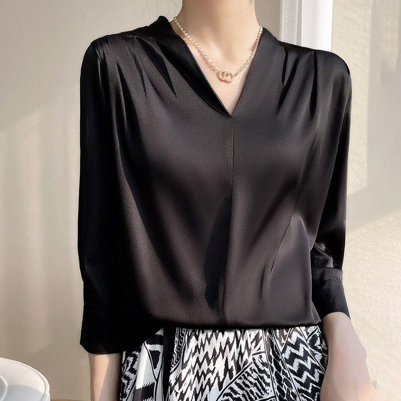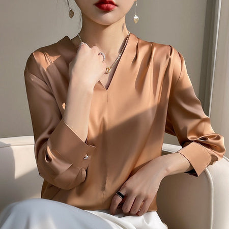 Women’s Imitation Mulberry Silk Satin V-Shape Shirt Bottom less
