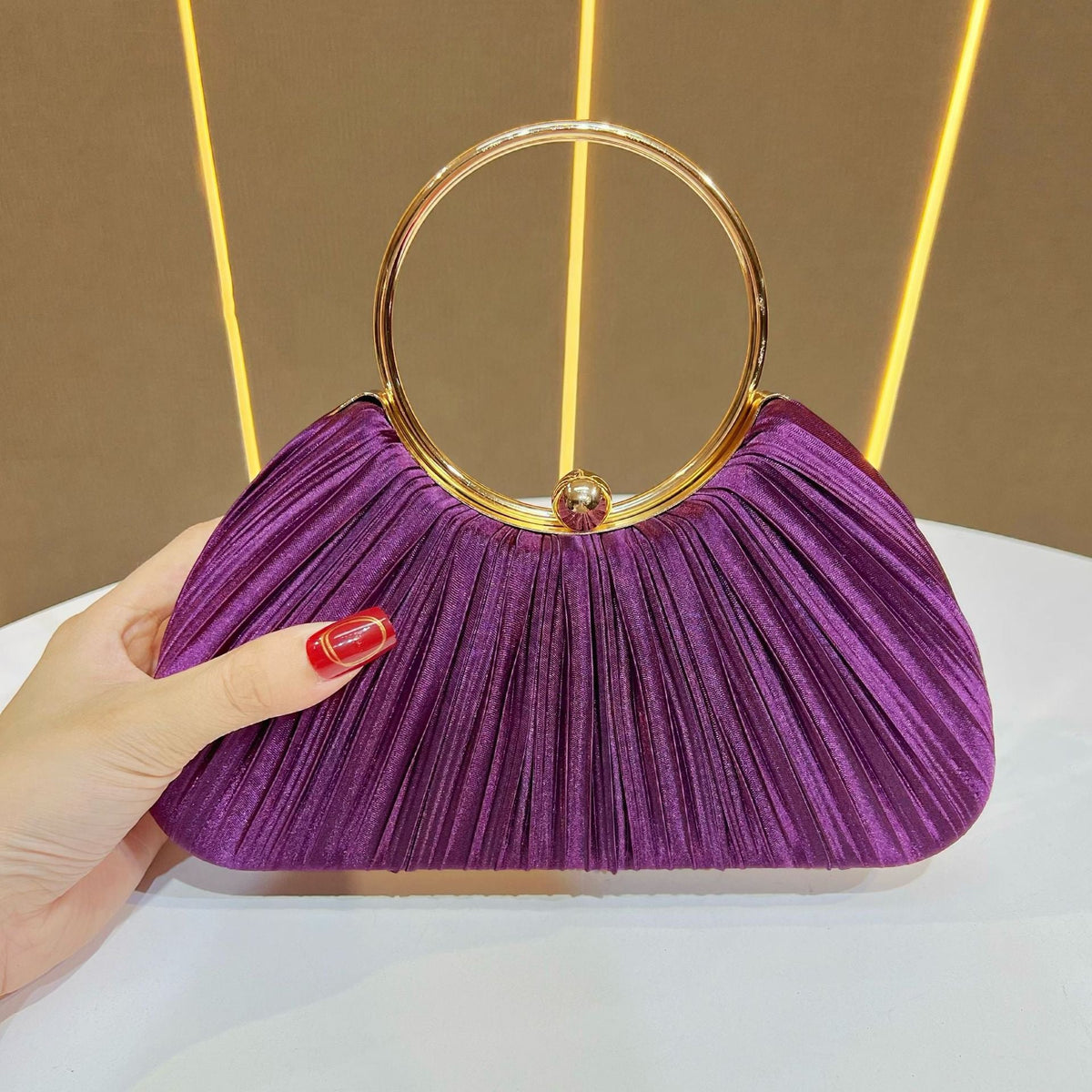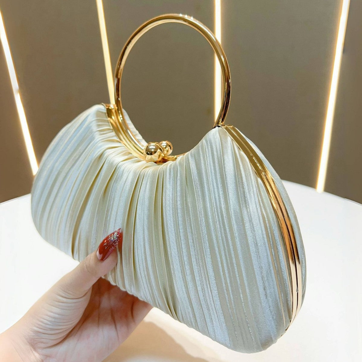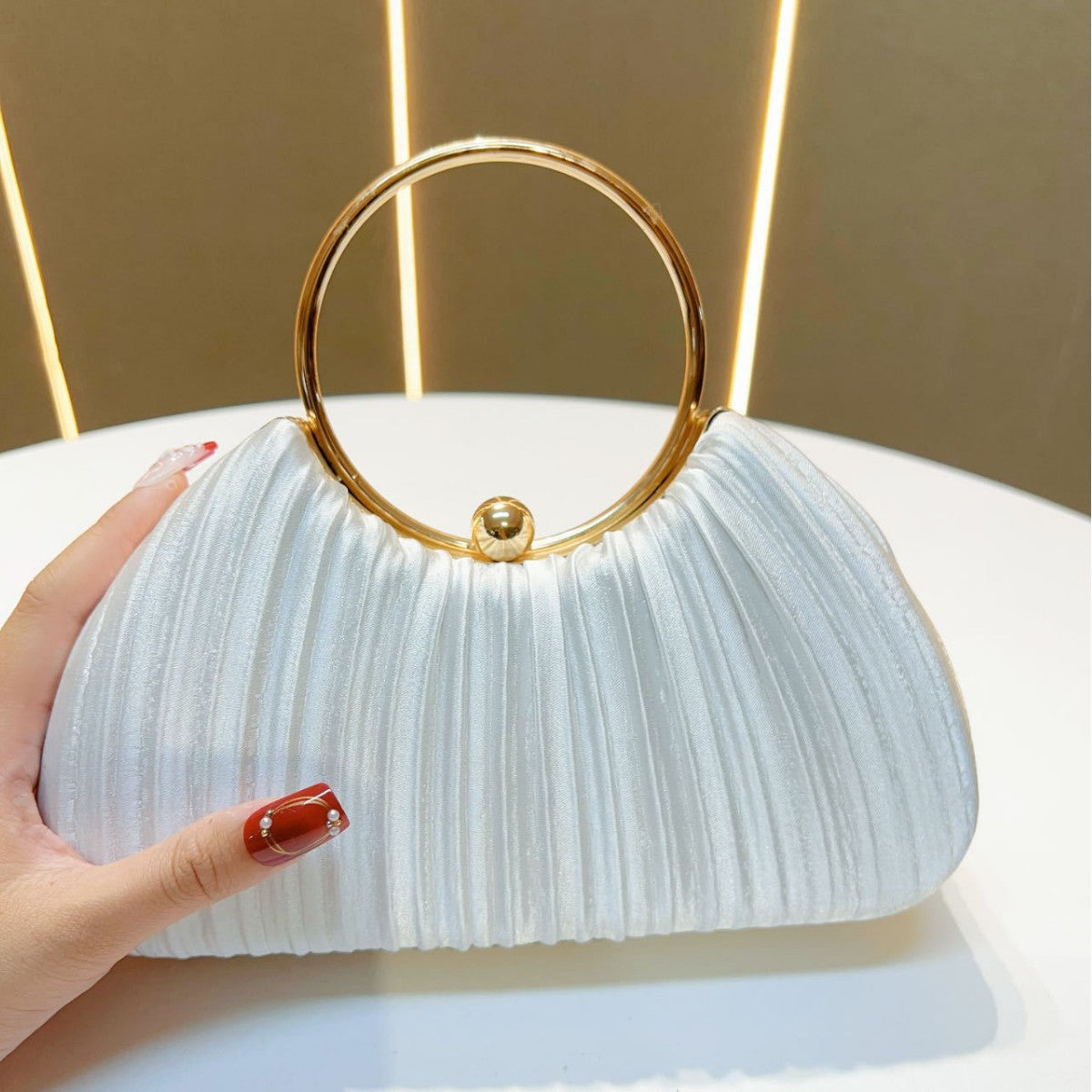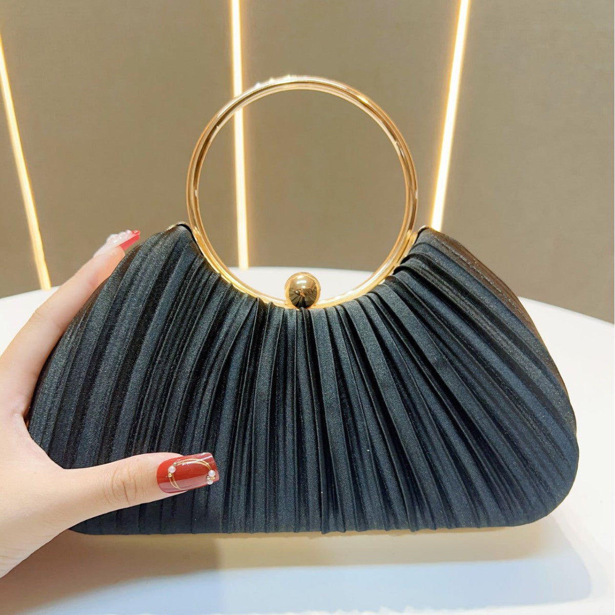 Pair this evening bag with cocktail dresses, evening gowns, or party outfits for a polished look. Its sleek design and pleated texture make it a versatile accessory for a variety of events, ensuring you stand out effortlessly.