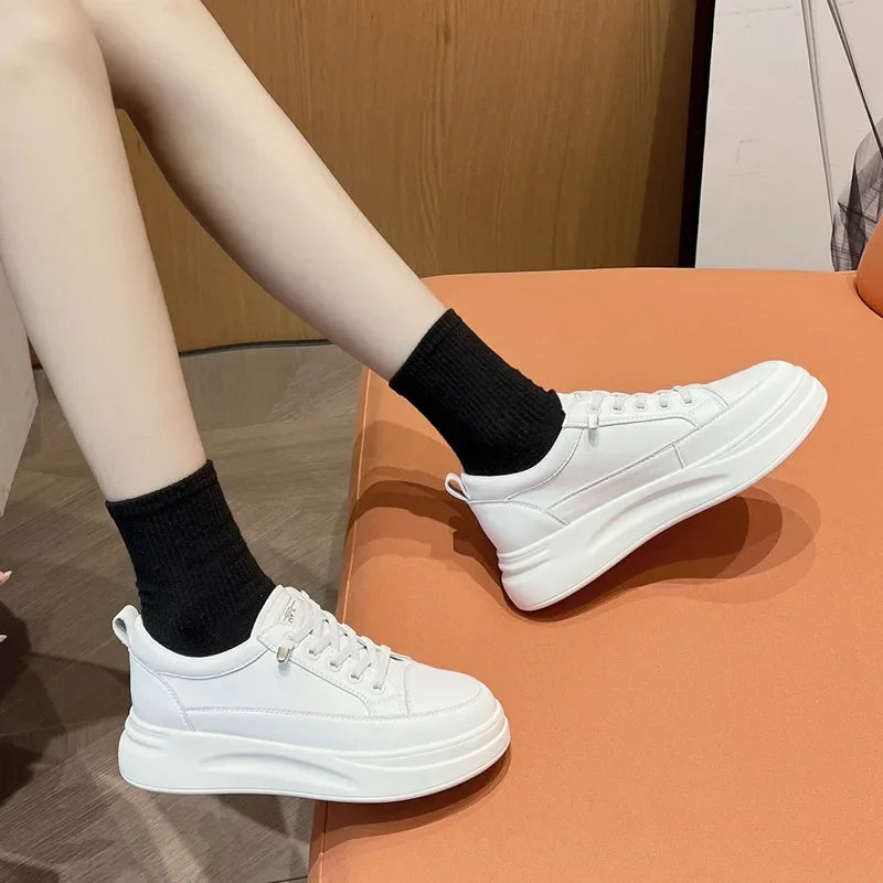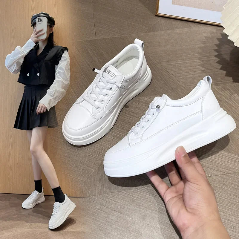 Step up your daily style with these Women’s Genuine Leather White Sneakers, designed to blend comfort, fashion, and function. These stylish flat shoes feature a lightweight build and a hidden height-increasing sole, giving you a natural lift without sacrificing ease of movement.