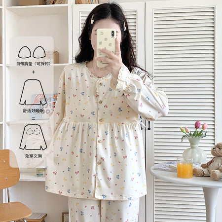 Embrace charm and practicality with the Bow-Knot Maternity Pajamas, designed with chest pads and nursing-friendly features for year-round comfort. Suitable for spring, autumn, and winter, they bring both elegance and convenience to your motherhood wardrobe.