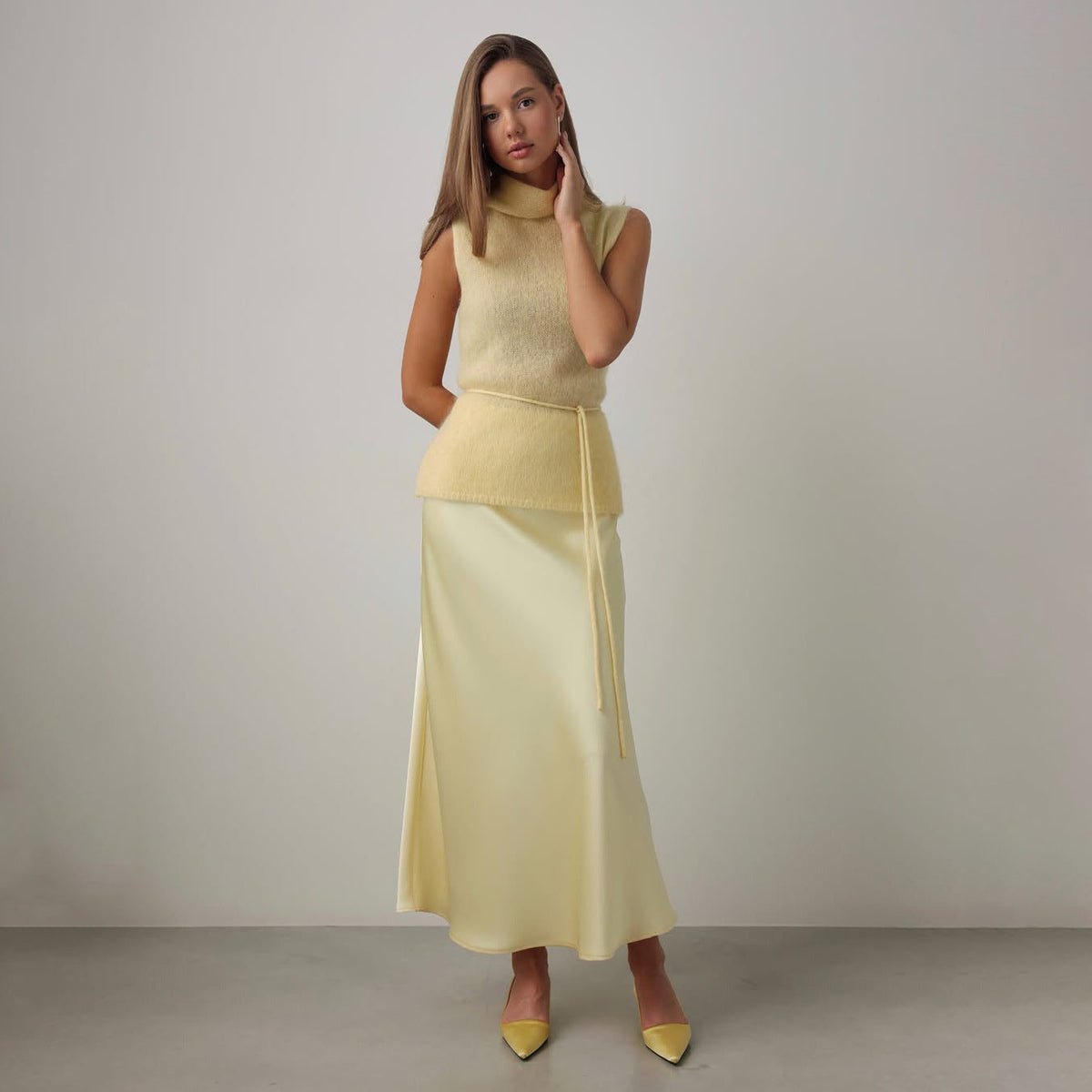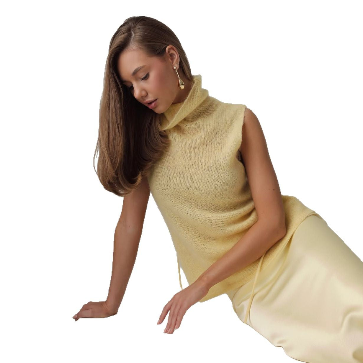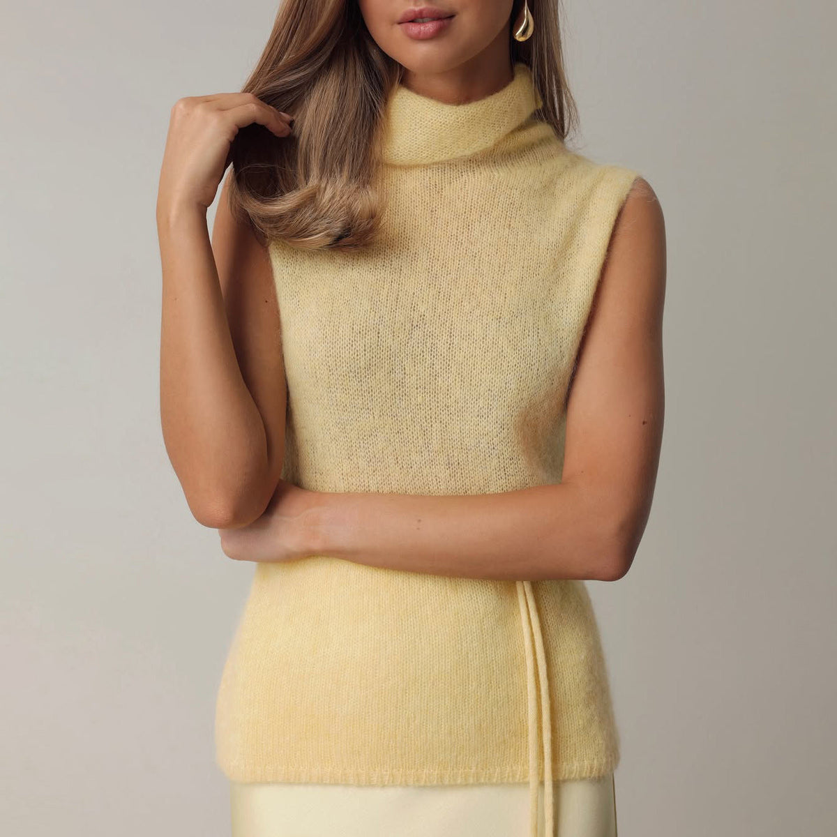 Crafted from soft plush knit fabric, it feels gentle against the skin while providing lightweight comfort for warm weather. The high-collar design adds a touch of sophistication, and the sleeveless cut ensures breathability and freedom of movement. Perfect for pairing with skirts, pants, or under jackets, this knitted base shirt is a chic addition to any seasonal wardrobe.