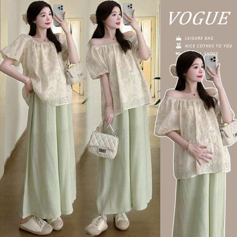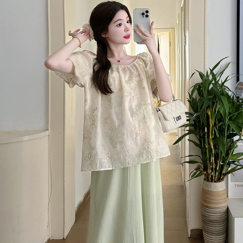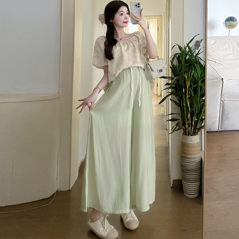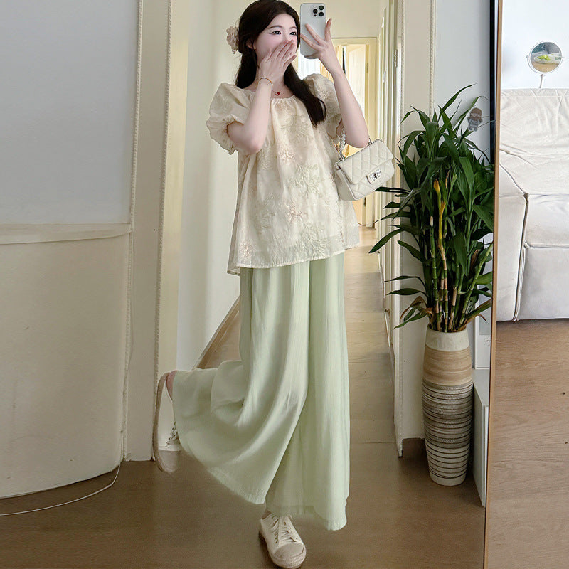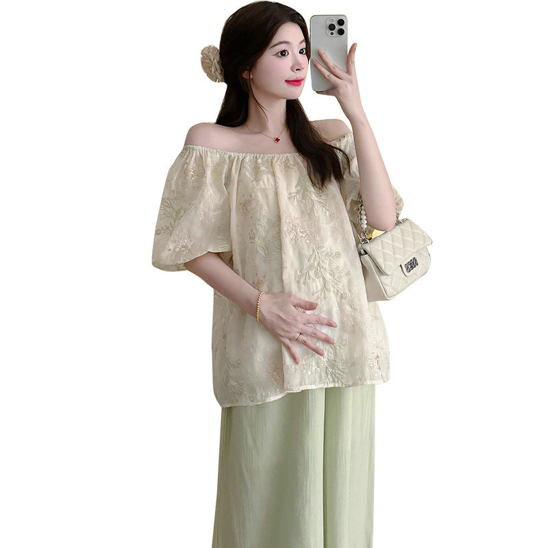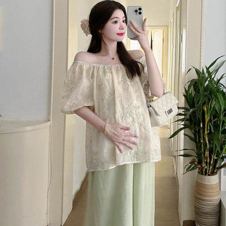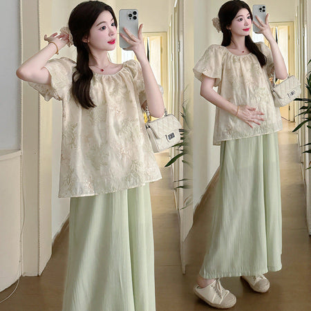The thin, breathable fabric keeps you fresh in warm weather, while the loose-fitting design ensures comfort for your growing belly. The playful bubble sleeves and square collar add a trendy, feminine touch, making this set both cute and fashionable. Easy to wear and mix-and-match, it’s a versatile addition to any maternity wardrobe.