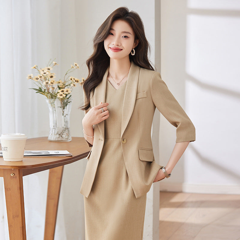 Two-Piece Set: Includes a tailored blazer with seven-sleeve design and a matching dress.