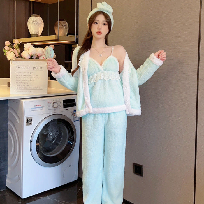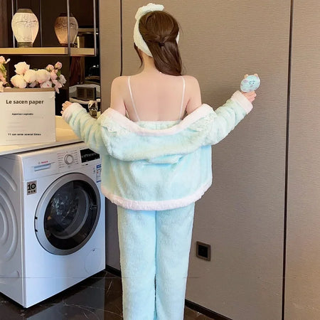Embrace cozy elegance with this Real Shot Autumn and Winter Pajama Set, designed to keep you warm and stylish during the colder months. πβοΈ Featuring a sexy sling design, this set includes a flannel robe and a matching headband, offering both comfort and chic allure for your lounging moments at home.