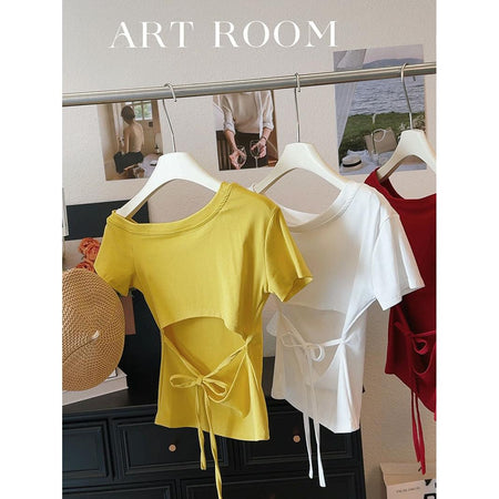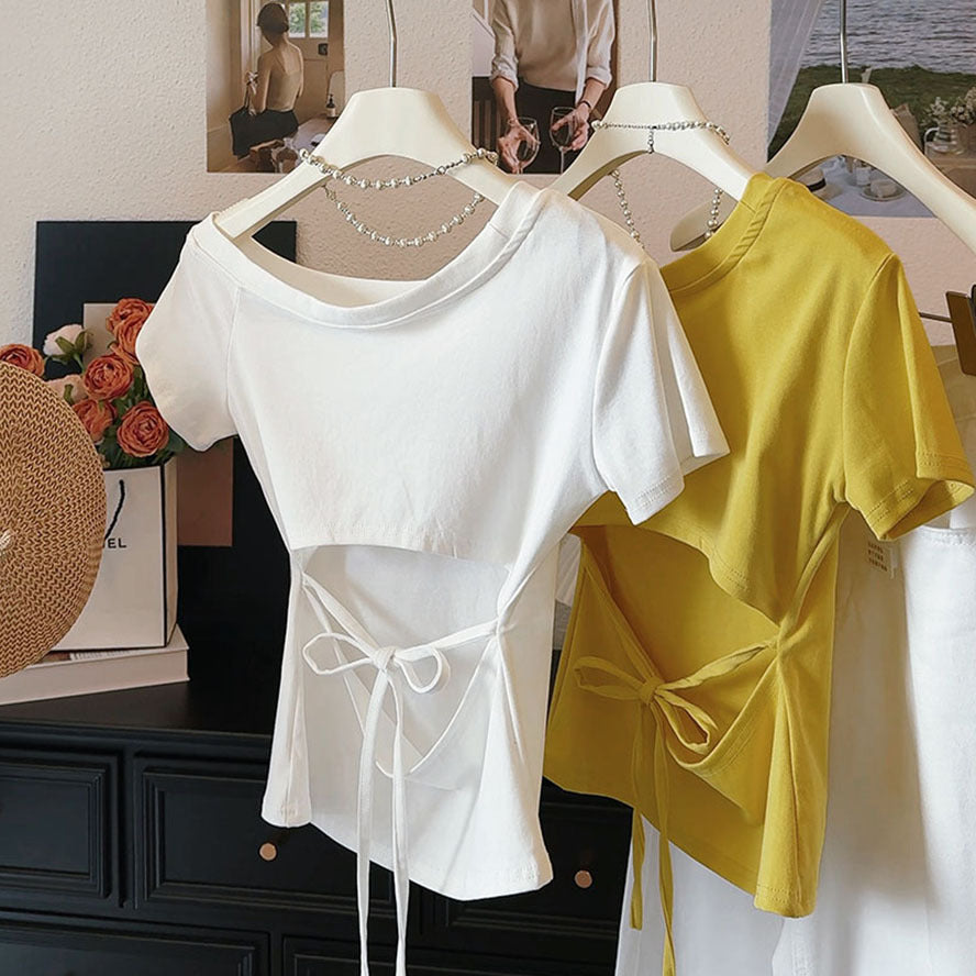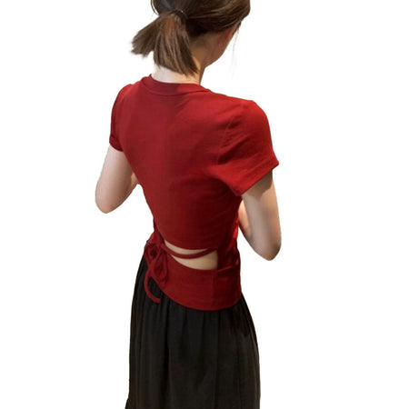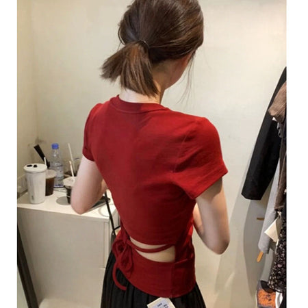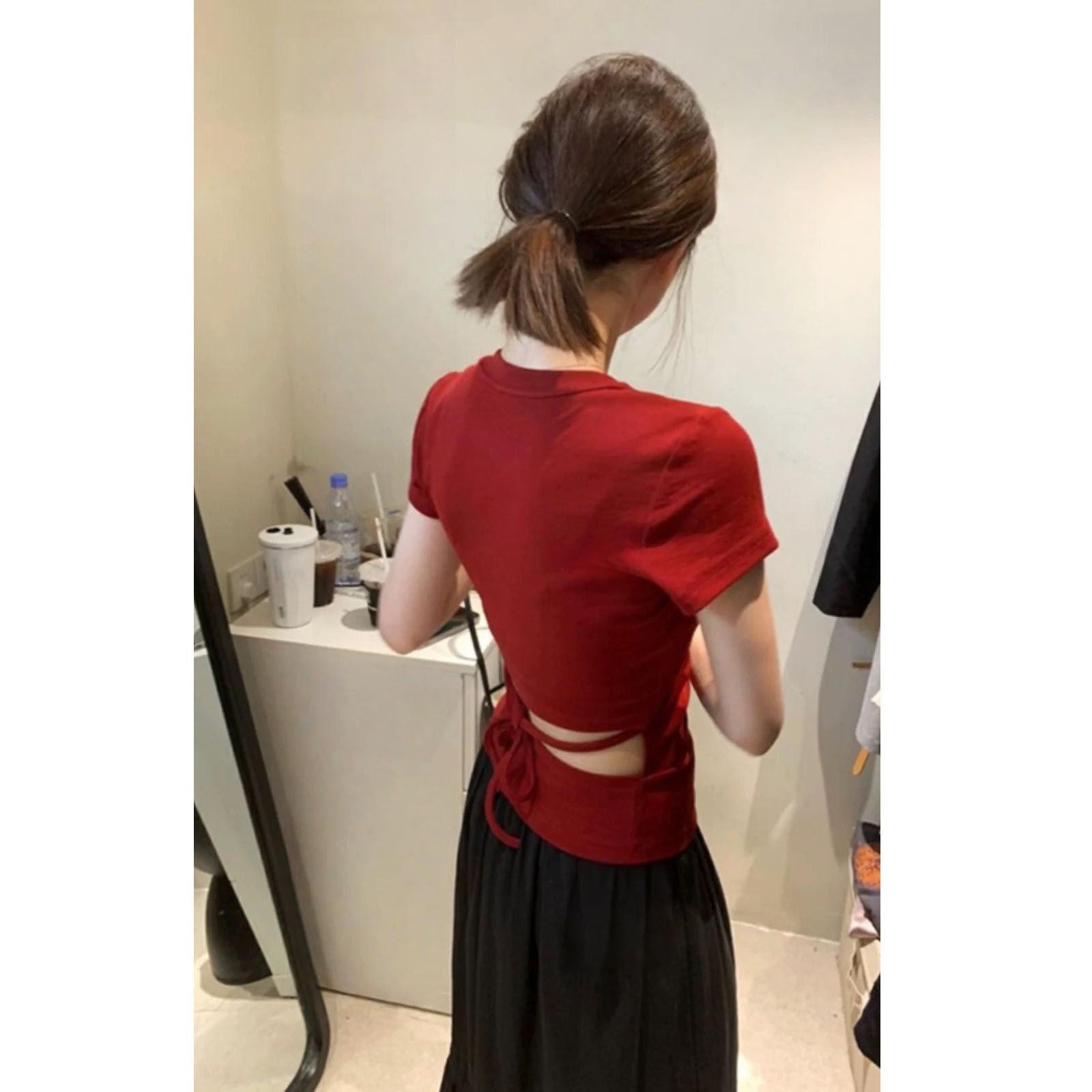 Get noticed this summer with our Korean-Style Red Short-Sleeve T-Shirt for Women 🌺. This stunning top blends cute and chic with a lace-up hollow-out shoulder design, perfect for adding a stylish twist to your casual wardrobe 💫.