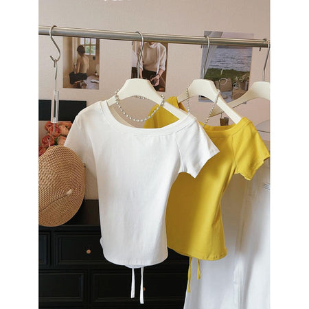 Crafted from soft, breathable fabric, this crewneck tee features gentle pleats at the neckline for a flattering, feminine silhouette. The slim-fit cut hugs your figure just right, making it easy to pair with high-waisted jeans, skirts, or shorts 👖👗.