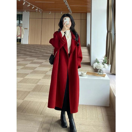 Its mid-length cut flatters every figure while providing excellent warmth. The loose, elegant design layers easily over sweaters, dresses, or office wear, making it versatile for both casual outings and formal events. The vibrant red adds a bold yet graceful touch that turns heads wherever she goes.
