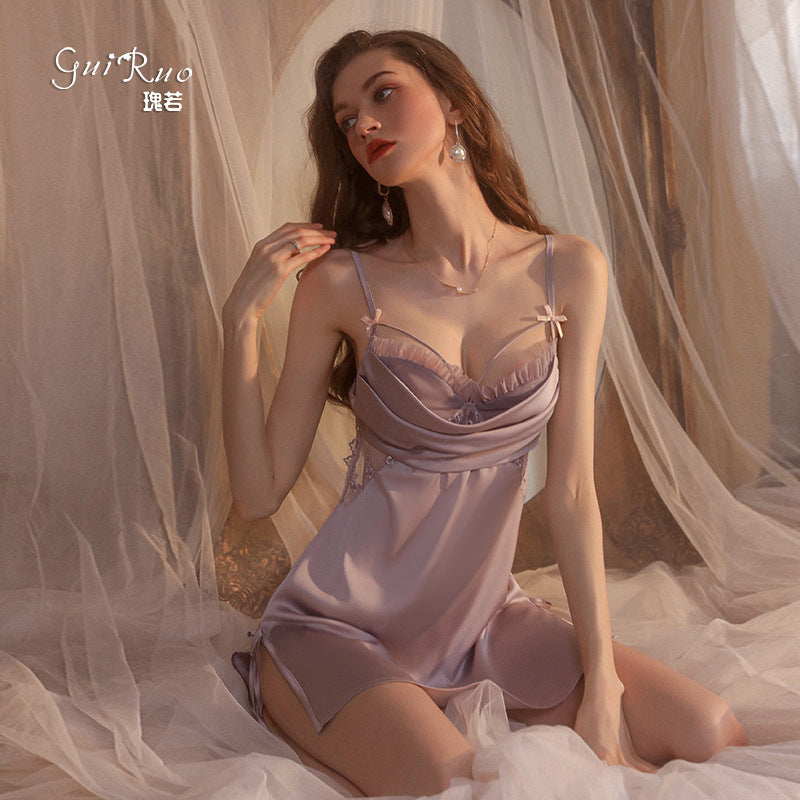 Perfect for cozy nights or special moments at home, this elegant suit combines comfort with sensual style. The soft satin fabric feels silky against your skin, while the lace trim and open split add a captivating touch of romance. ππ