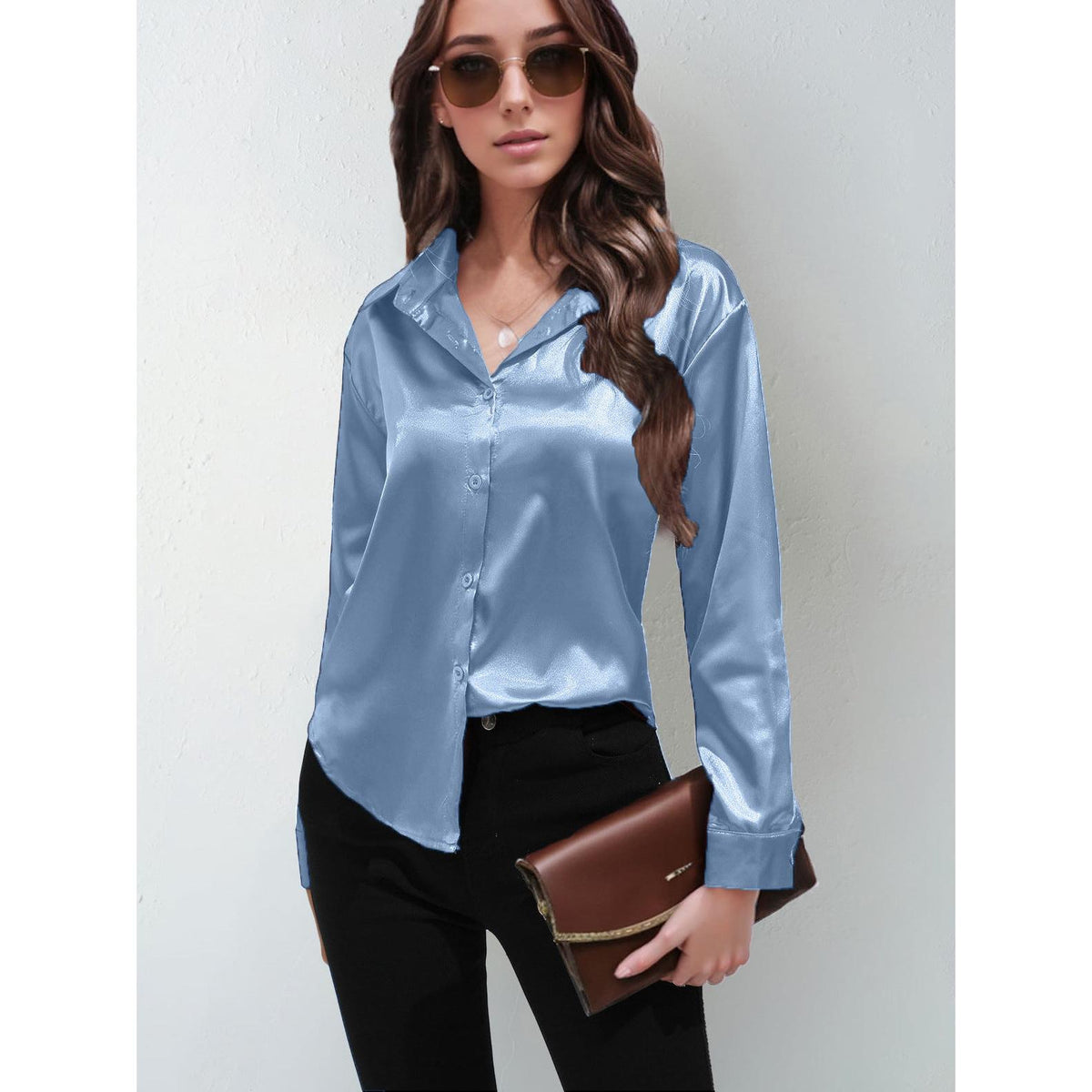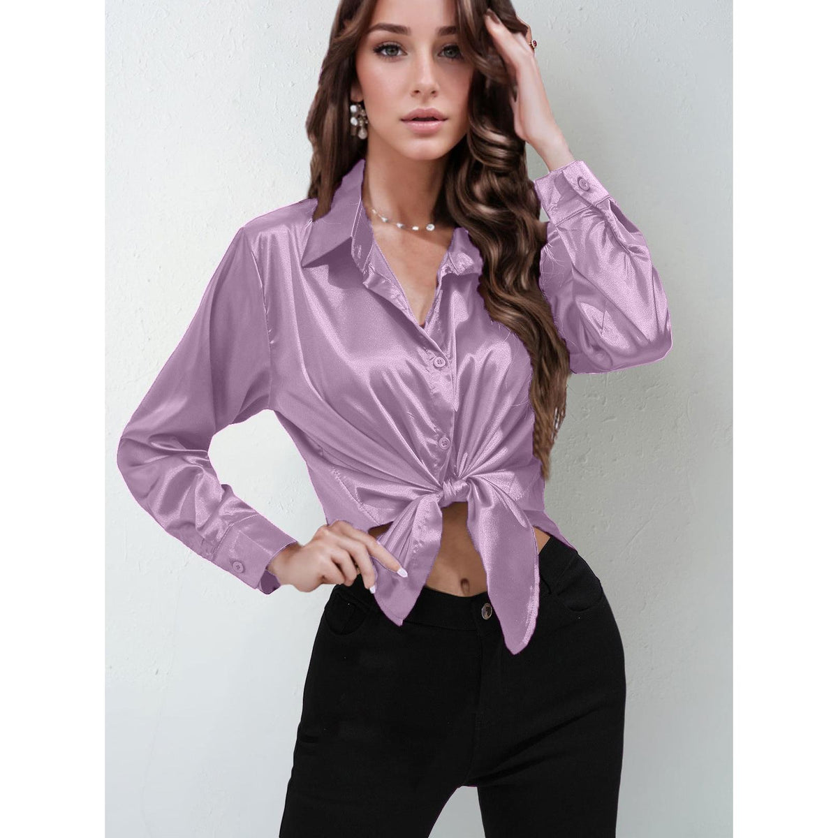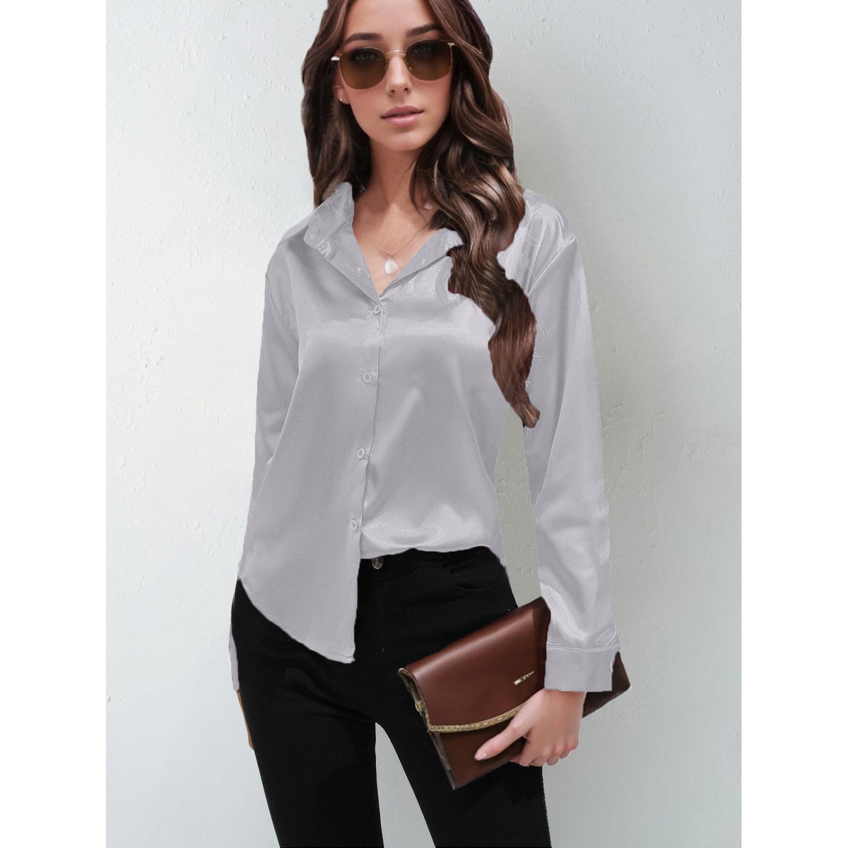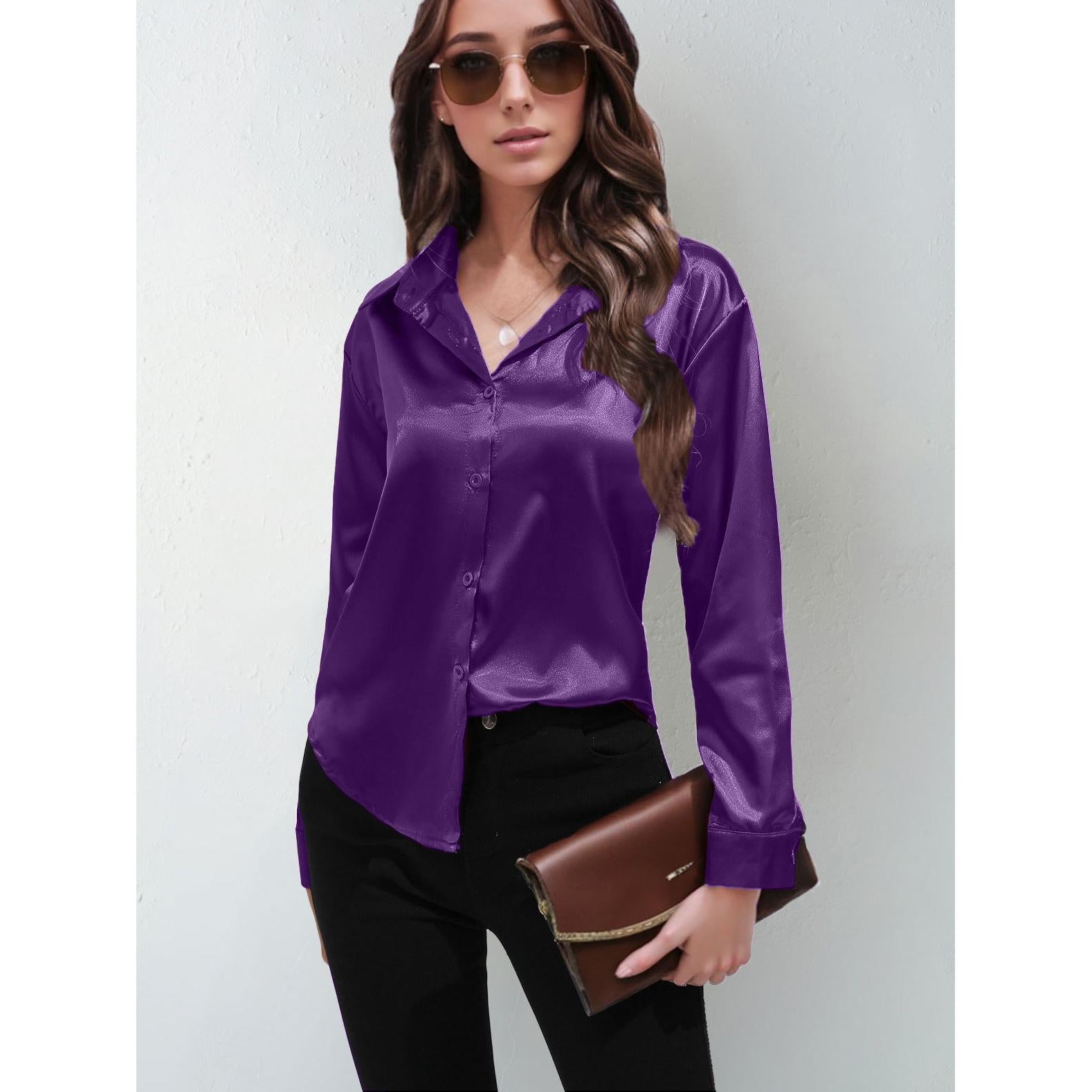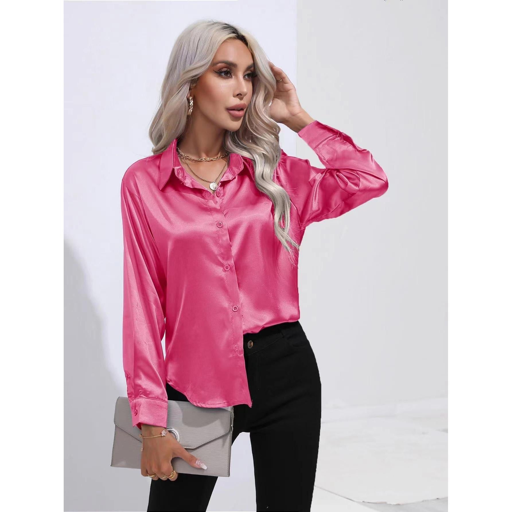 Add a touch of luxury to your wardrobe with this Women’s Satin Imitation Silk Long Sleeve Shirt! ✨💖 Smooth and shiny, this elegant solid-color top features a classic button-front and stylish lapel collar, perfect for making a statement in Nepal’s fashion scene. 🇳🇵🌟
