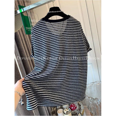 βοΈ Upgrade your wardrobe with this special offer 2025 extra-large striped T-shirt! Featuring bright silver woven stripes and a collar Solona design, it combines classic style with a modern twist, perfect for American and European fashion lovers.