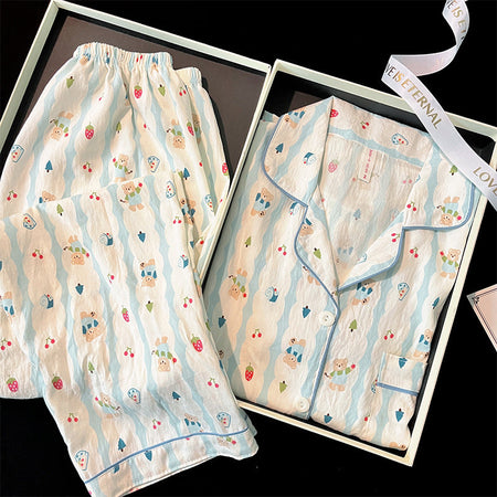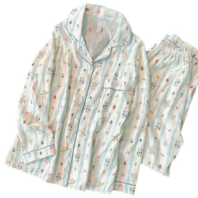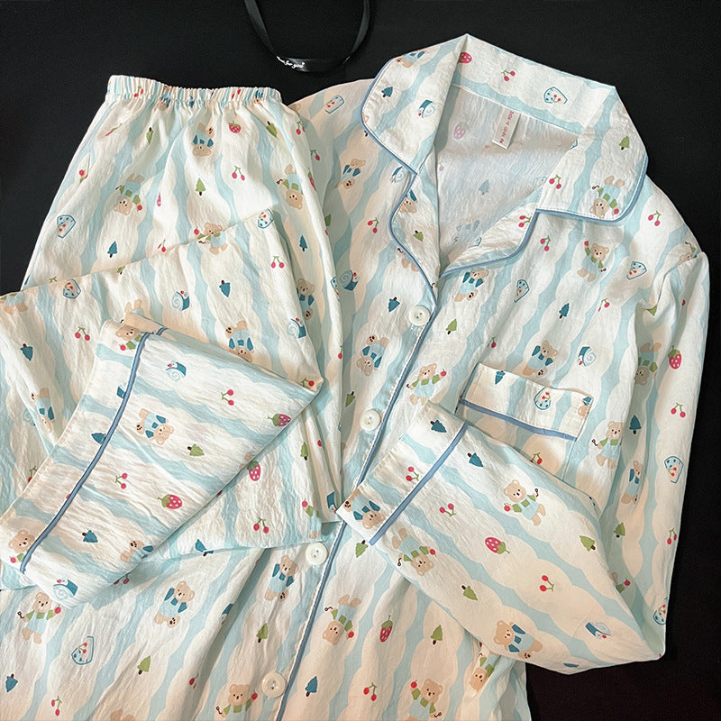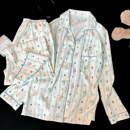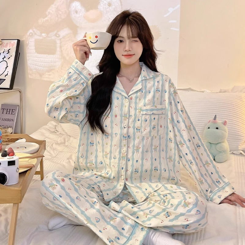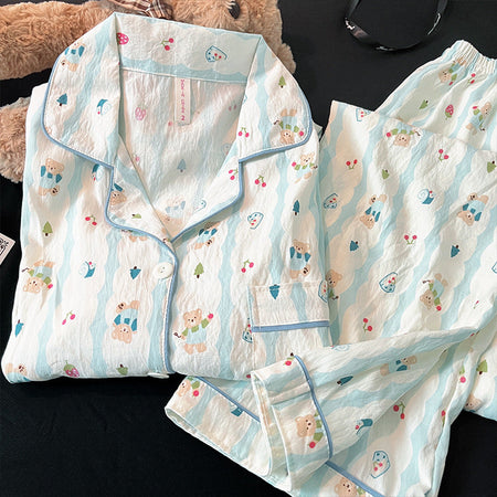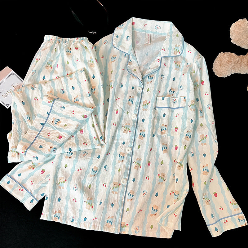 🍓 Cuteness overload! These cloud cotton pajamas with a strawberry bear print and cardigan-style top are just what you need for cozy days and dreamy nights ☁️🐻. The long sleeve set is lightweight and soft, perfect for spring and autumn chill.